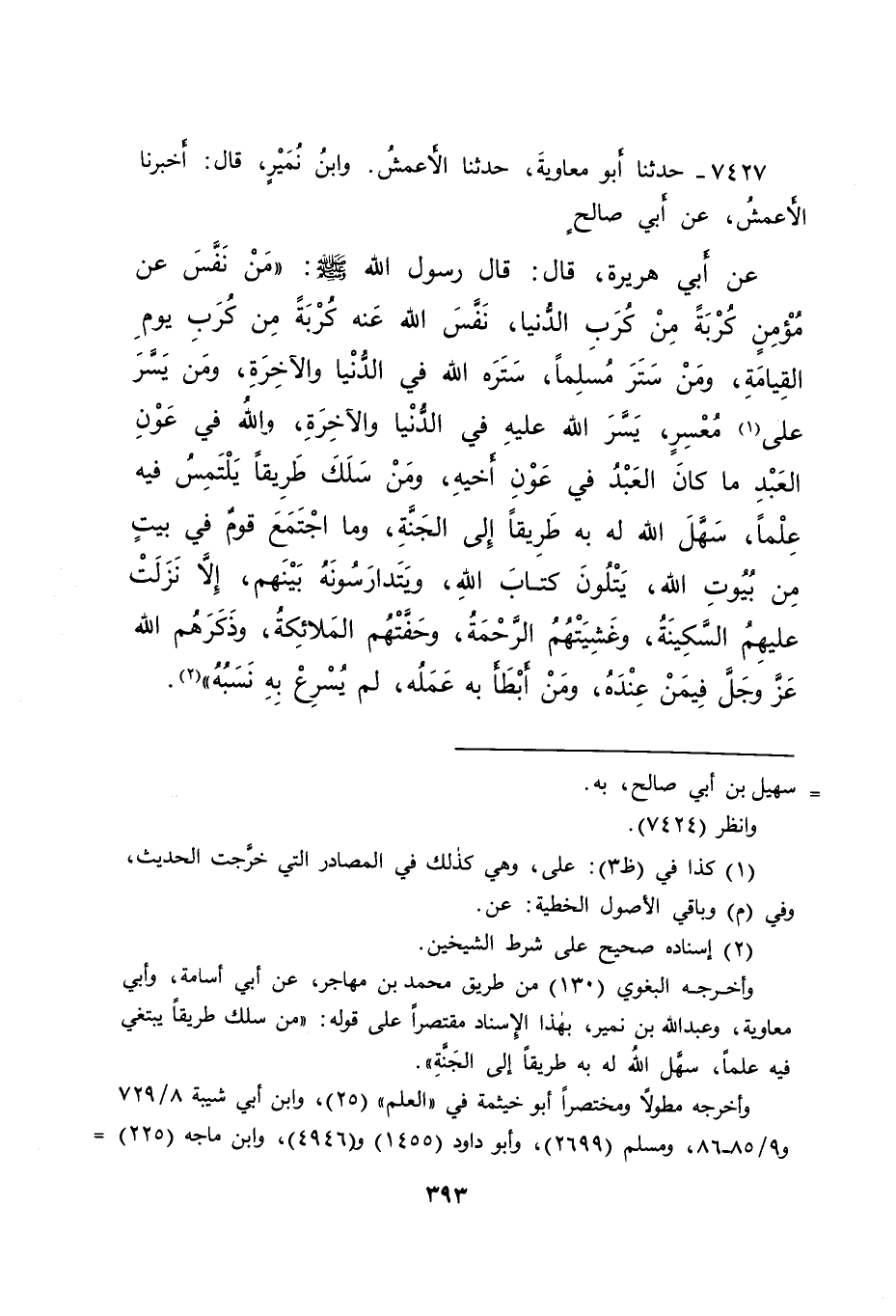 ٧٤٢٧ - حَدَّثَنَا أَبُو مُعَاوِيَةَ، حَدَّثَنَا الْأَعْمَشُ، وَابْنُ نُمَيْرٍ، قَالَ: أَخْبَرَنَا الْأَعْمَشُ، عَنْ أَبِي صَالِحٍ، عَنْ أَبِي هُرَيْرَةَ، قَالَ: قَالَ رَسُولُ اللهِ صَلَّى اللهُ عَلَيْهِ وَسَلَّمَ: " مَنْ نَفَّسَ عَنْ مُؤْمِنٍ كُرْبَةً مِنْ كُرَبِ الدُّنْيَا، نَفَّسَ اللهُ عَنْهُ كُرْبَةً مِنْ كُرَبِ يَوْمِ الْقِيَامَةِ، وَمَنْ سَتَرَ مُسْلِمًا، سَتَرَهُ اللهُ فِي الدُّنْيَا وَالْآخِرَةِ، وَمَنْ يَسَّرَ عَلَى (١) مُعْسِرٍ، يَسَّرَ اللهُ عَلَيْهِ فِي الدُّنْيَا وَالْآخِرَةِ، وَاللهُ فِي عَوْنِ الْعَبْدِ مَا كَانَ الْعَبْدُ فِي عَوْنِ أَخِيهِ، وَمَنْ سَلَكَ طَرِيقًا يَلْتَمِسُ فِيهِ عِلْمًا، سَهَّلَ اللهُ لَهُ بِهِ طَرِيقًا إِلَى الْجَنَّةِ، وَمَا اجْتَمَعَ قَوْمٌ فِي بَيْتٍ مِنْ بُيُوتِ اللهِ يَتْلُونَ كِتَابَ اللهِ، وَيَتَدَارَسُونَهُ بَيْنَهُمْ، إِلَّا نَزَلَتْ عَلَيْهِمْ السَّكِينَةُ، وَغَشِيَتْهُمْ الرَّحْمَةُ، وَحَفَّتْهُمُ الْمَلَائِكَةُ، وَذَكَرَهُمُ اللهُ عَزَّ وَجَلَّ فِيمَنْ عِنْدَهُ، وَمَنْ أَبْطَأَ بِهِ عَمَلُهُ، لَمْ يُسْرِعْ بِهِ نَسَبُهُ " (٢)