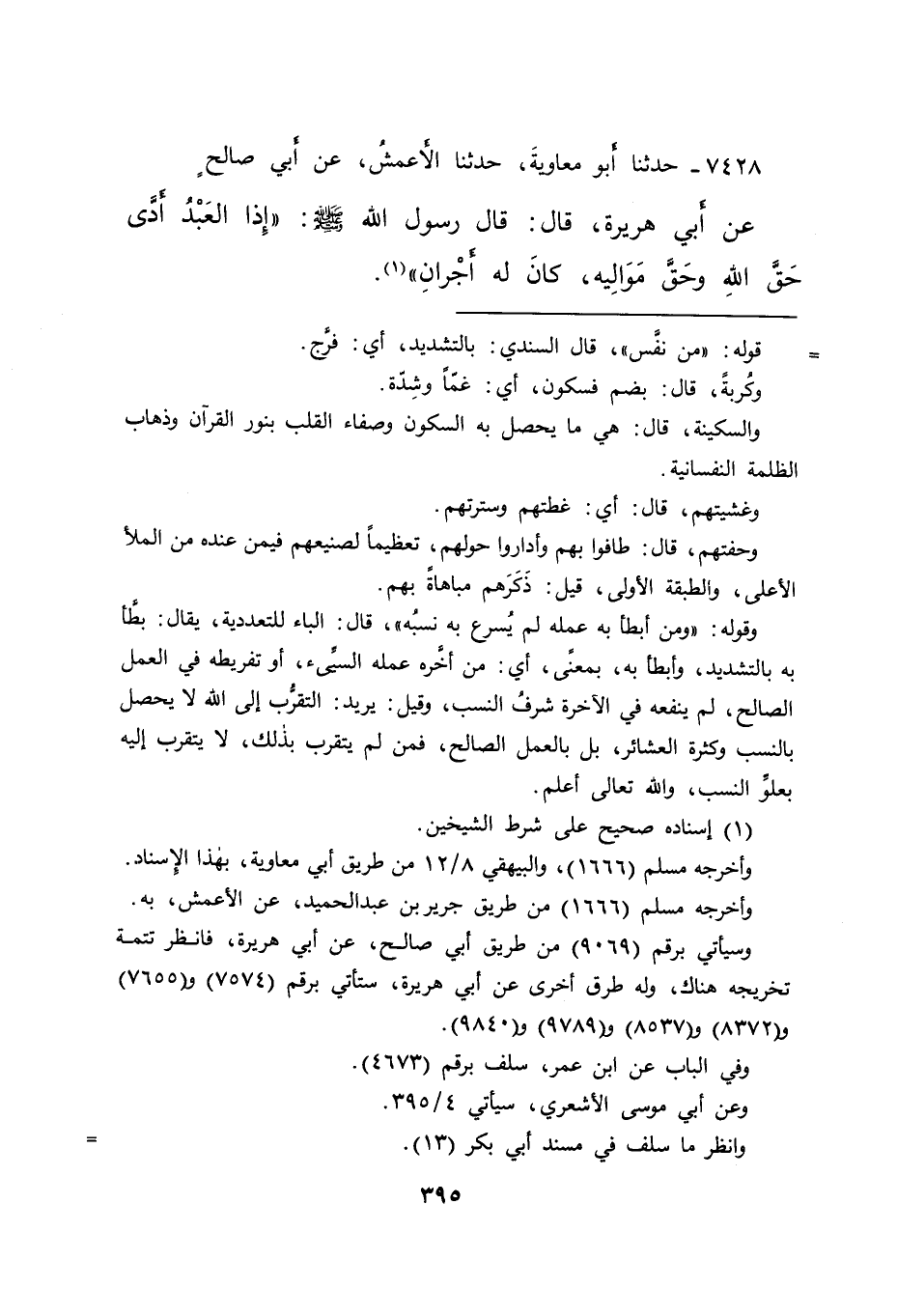 ٧٤٢٨ - حَدَّثَنَا أَبُو مُعَاوِيَةَ، حَدَّثَنَا الْأَعْمَشُ، عَنْ أَبِي صَالِحٍ، عَنْ أَبِي هُرَيْرَةَ، قَالَ: قَالَ رَسُولُ اللهِ صَلَّى اللهُ عَلَيْهِ وَسَلَّمَ: " إِذَا الْعَبْدُ أَدَّى حَقَّ اللهِ وَحَقَّ مَوَالِيهِ، كَانَ لَهُ أَجْرَانِ " (١)