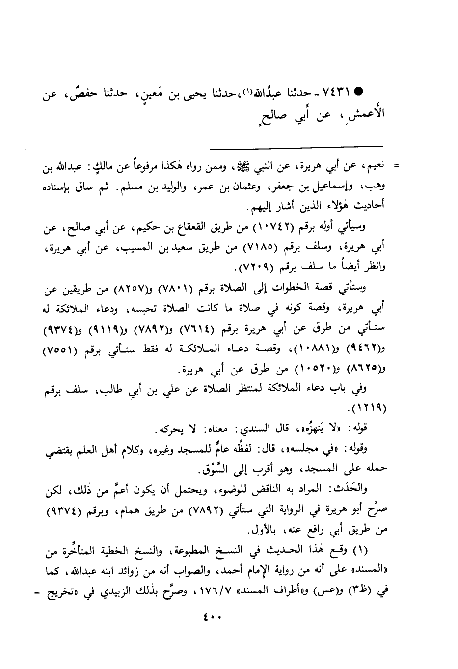 • ٧٤٣١ - حَدَّثَنَا عَبْدُ اللهِ (١) ، حَدَّثَنَا يَحْيَى بْنُ مَعِينٍ، حَدَّثَنَا حَفْصٌ، عَنِ الْأَعْمَشِ، عَنْ أَبِي صَالِحٍ،