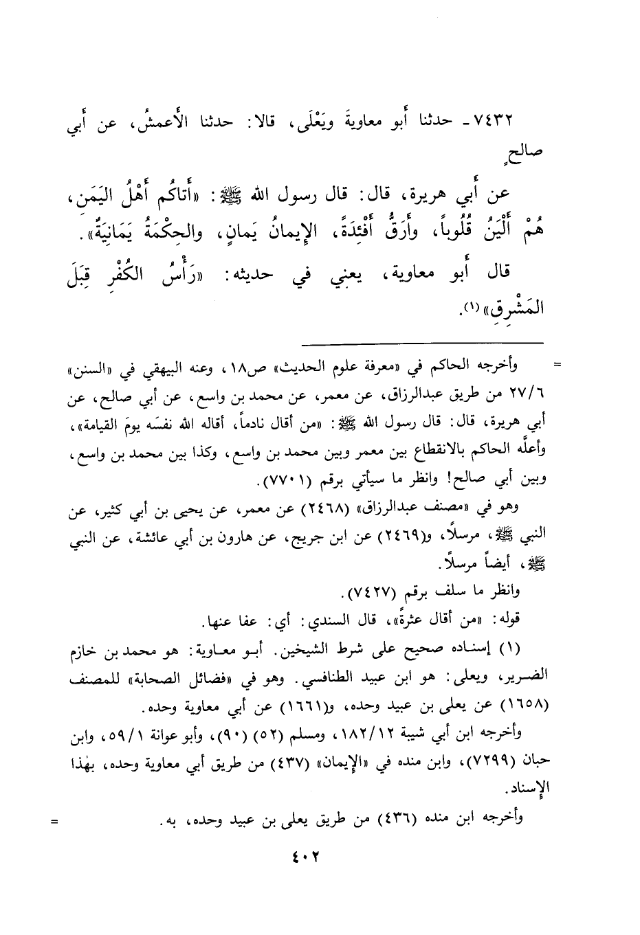 ٧٤٣٢ - حَدَّثَنَا أَبُو مُعَاوِيَةَ، وَيَعْلَى، قَالَا: حَدَّثَنَا الْأَعْمَشُ، عَنْ أَبِي صَالِحٍ، عَنْ أَبِي هُرَيْرَةَ، قَالَ: قَالَ رَسُولُ اللهِ صَلَّى اللهُ عَلَيْهِ وَسَلَّمَ: " أَتَاكُمْ أَهْلُ الْيَمَنِ، هُمْ أَلْيَنُ قُلُوبًا، وَأَرَقُّ أَفْئِدَةً، الْإِيمَانُ يَمَانٍ، وَالْحِكْمَةُ يَمَانِيَةٌ " قَالَ أَبُو مُعَاوِيَةَ، يَعْنِي فِي حَدِيثِهِ: " رَأْسُ الْكُفْرِ قِبَلَ الْمَشْرِقِ " (١)