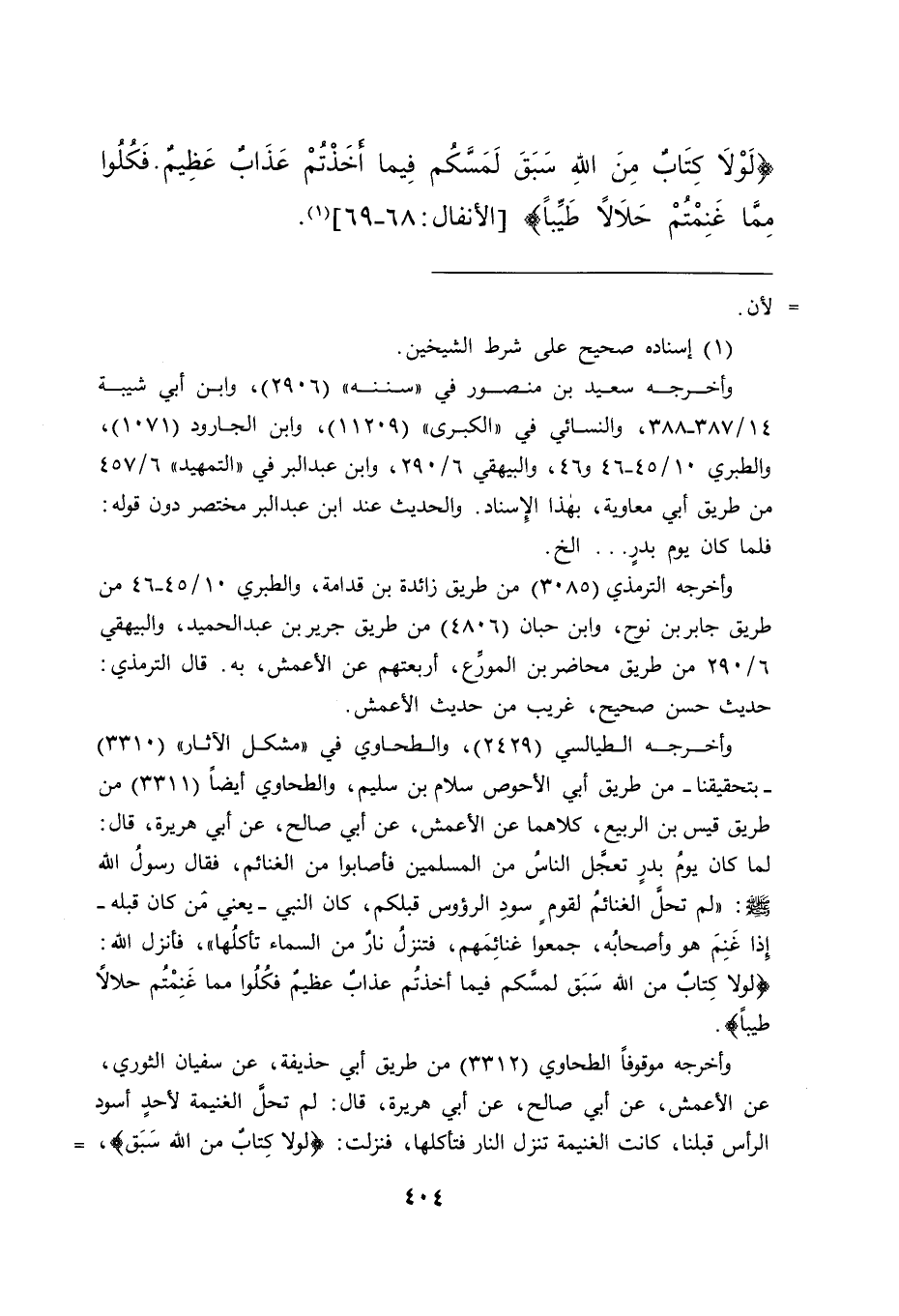 لَوْلَا كِتَابٌ مِنَ اللهِ سَبَقَ لَمَسَّكُمْ فِيمَا أَخَذْتُمْ عَذَابٌ عَظِيمٌ فَكُلُوا مِمَّا غَنِمْتُمْ حَلَالًا طَيِّبًا} [الأنفال: ٦٩] (١)
