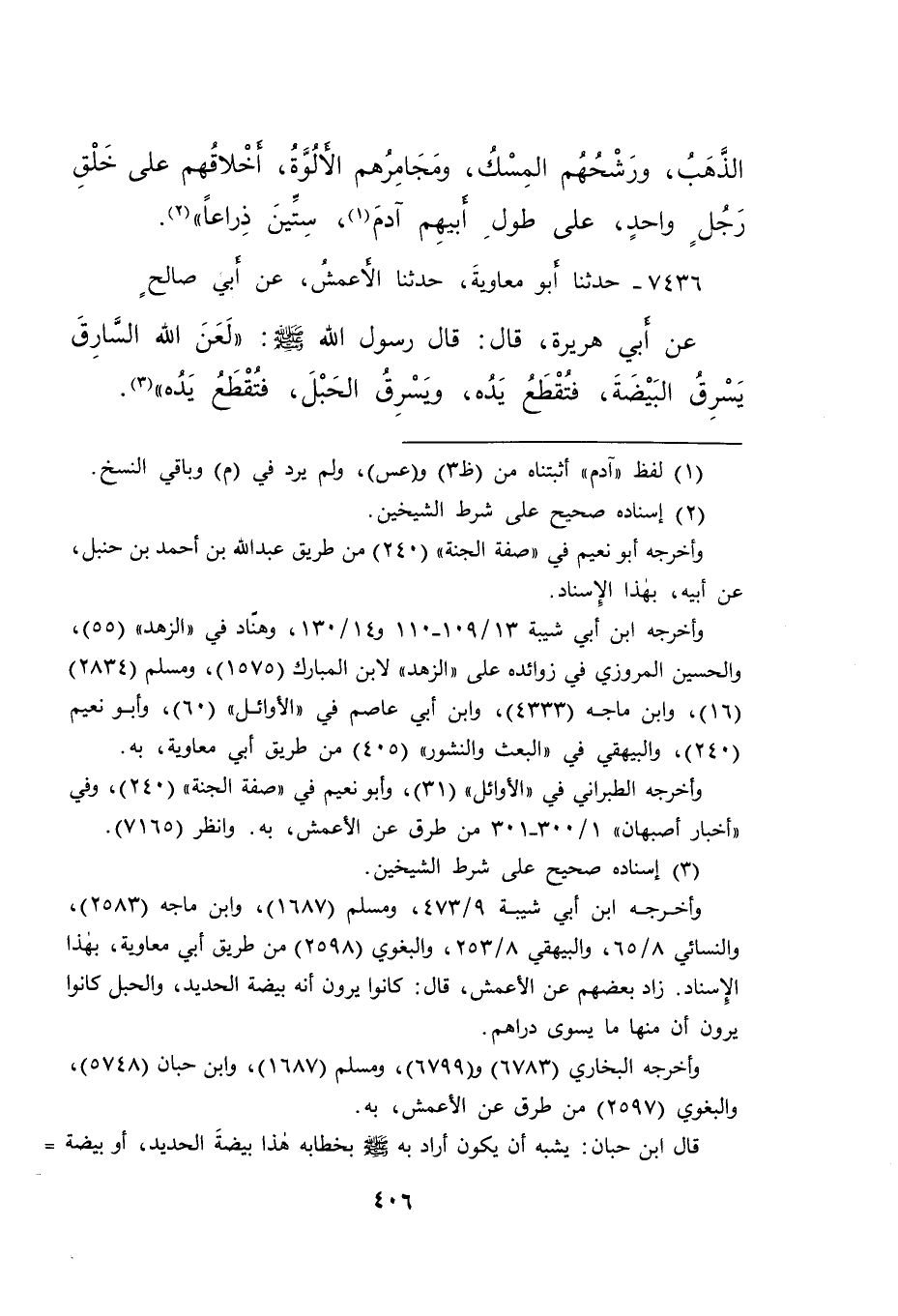 ٧٤٣٦ - حَدَّثَنَا أَبُو مُعَاوِيَةَ، حَدَّثَنَا الْأَعْمَشُ، عَنْ أَبِي صَالِحٍ، عَنْ أَبِي هُرَيْرَةَ، قَالَ: قَالَ رَسُولُ اللهِ صَلَّى اللهُ عَلَيْهِ وَسَلَّمَ: " لَعَنَ اللهُ السَّارِقَ يَسْرِقُ الْبَيْضَةَ، فَتُقْطَعُ يَدُهُ، وَيَسْرِقُ الْحَبْلَ، فَتُقْطَعُ يَدُهُ " (٣)