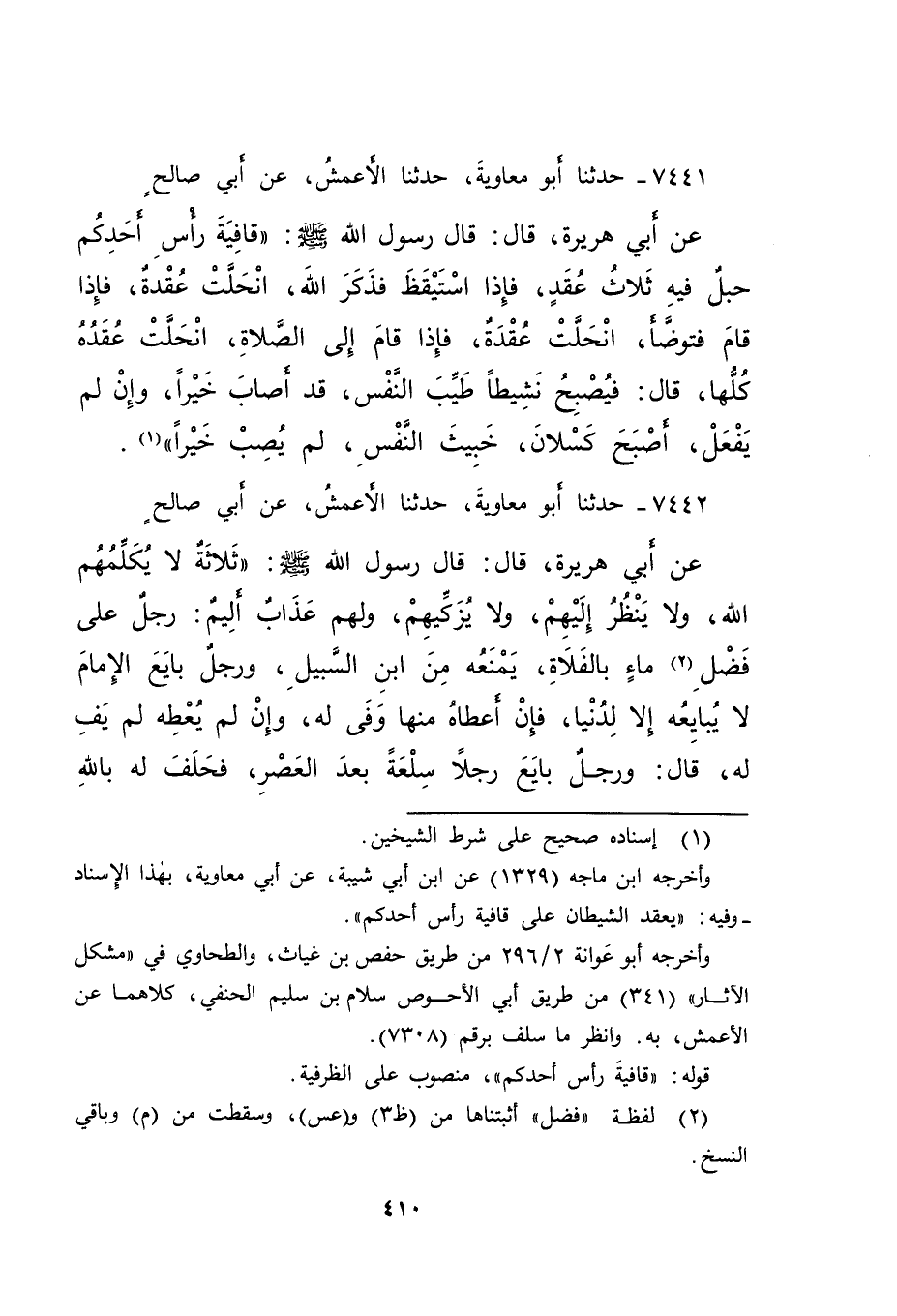 ٧٤٤٢ - حَدَّثَنَا أَبُو مُعَاوِيَةَ، حَدَّثَنَا الْأَعْمَشُ، عَنْ أَبِي صَالِحٍ، عَنْ أَبِي هُرَيْرَةَ، قَالَ: قَالَ رَسُولُ اللهِ صَلَّى اللهُ عَلَيْهِ وَسَلَّمَ: " ثَلَاثَةٌ لَا يُكَلِّمُهُمُ اللهُ، وَلَا يَنْظُرُ إِلَيْهِمْ، وَلَا يُزَكِّيهِمْ، وَلَهُمْ عَذَابٌ أَلِيمٌ: رَجُلٌ عَلَى فَضْلِ (٢) مَاءٍ بِالْفَلَاةِ، يَمْنَعُهُ مِنَ ابْنِ السَّبِيلِ، وَرَجُلٌ بَايَعَ الْإِمَامَ لَا يُبَايِعُهُ إِلَّا لِدُنْيَا، فَإِنْ أَعْطَاهُ مِنْهَا وَفَى لَهُ، وَإِنْ لَمْ يُعْطِهِ لَمْ يَفِ لَهُ " قَالَ: " وَرَجُلٌ بَايَعَ رَجُلًا سِلْعَةً بَعْدَ الْعَصْرِ، فَحَلَفَ لَهُ بِاللهِ