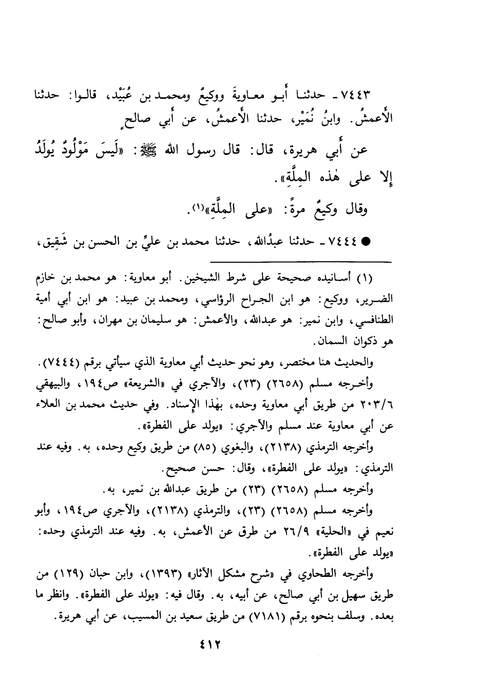 ٧٤٤٣ - حَدَّثَنَا أَبُو مُعَاوِيَةَ، وَوَكِيعٌ، وَمُحَمَّدُ بْنُ عُبَيْدٍ، قَالُوا: حَدَّثَنَا الْأَعْمَشُ، وَابْنُ نُمَيْرٍ، حَدَّثَنَا الْأَعْمَشُ، عَنْ أَبِي صَالِحٍ، عَنْ أَبِي هُرَيْرَةَ، قَالَ: قَالَ رَسُولُ اللهِ صَلَّى اللهُ عَلَيْهِ وَسَلَّمَ: " لَيْسَ مَوْلُودٌ يُولَدُ إِلَّا عَلَى هَذِهِ الْمِلَّةِ " وَقَالَ وَكِيعٌ، مَرَّةً: " عَلَى الْمِلَّةِ " (١)