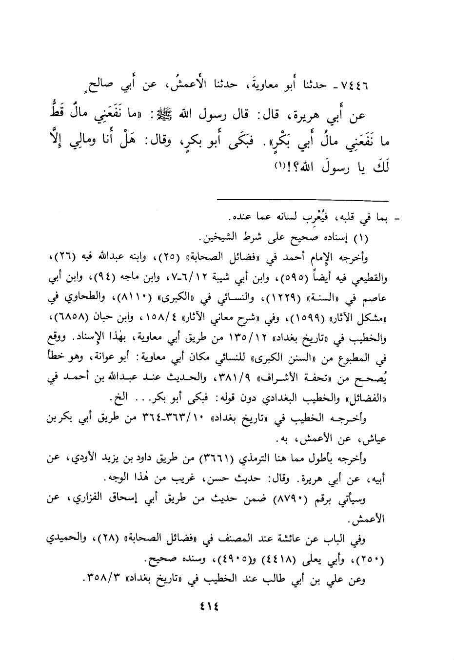 ٧٤٤٦ - حَدَّثَنَا أَبُو مُعَاوِيَةَ، حَدَّثَنَا الْأَعْمَشُ، عَنْ أَبِي صَالِحٍ، عَنْ أَبِي هُرَيْرَةَ، قَالَ: قَالَ رَسُولُ اللهِ صَلَّى اللهُ عَلَيْهِ وَسَلَّمَ: " مَا نَفَعَنِي مَالٌ قَطُّ، مَا نَفَعَنِي مَالُ أَبِي بَكْرٍ " فَبَكَى أَبُو بَكْرٍ، وَقَالَ: هَلْ أَنَا وَمَالِي إِلَّا لَكَ يَا رَسُولَ اللهِ؟ (١)