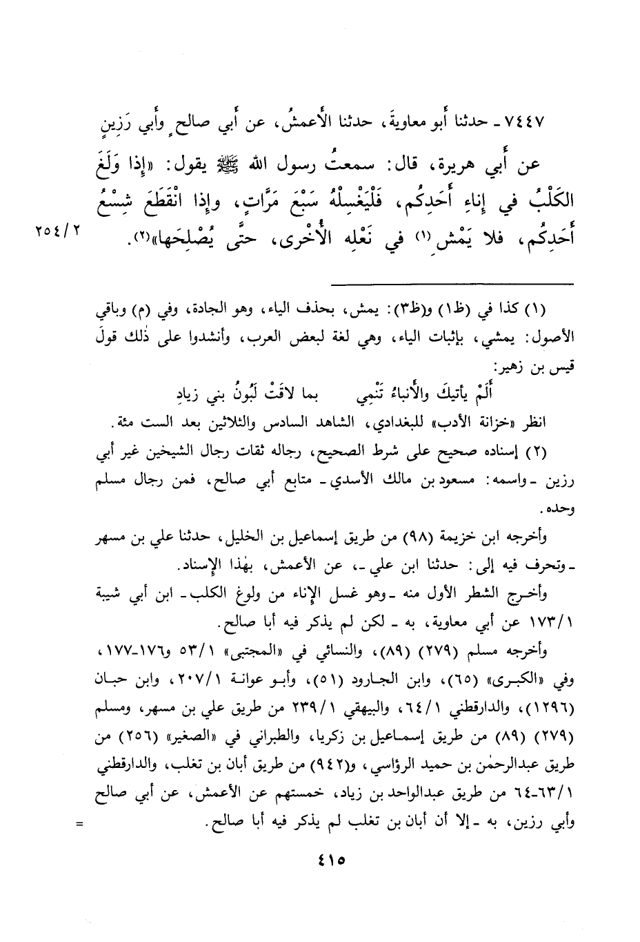 ٧٤٤٧ - حَدَّثَنَا أَبُو مُعَاوِيَةَ، حَدَّثَنَا الْأَعْمَشُ، عَنْ أَبِي صَالِحٍ، وَأَبِي رَزِينٍ، عَنْ أَبِي هُرَيْرَةَ، قَالَ: سَمِعْتُ رَسُولَ اللهِ صَلَّى اللهُ عَلَيْهِ وَسَلَّمَ يَقُولُ: " إِذَا وَلَغَ الْكَلْبُ فِي إِنَاءِ أَحَدِكُمْ، فَلْيَغْسِلْهُ سَبْعَ مَرَّاتٍ، وَإِذَا انْقَطَعَ شِسْعُ أَحَدِكُمْ، فَلَا يَمْشِ (١) فِي نَعْلِهِ الْأُخْرَى، حَتَّى يُصْلِحَهَا " (٢)