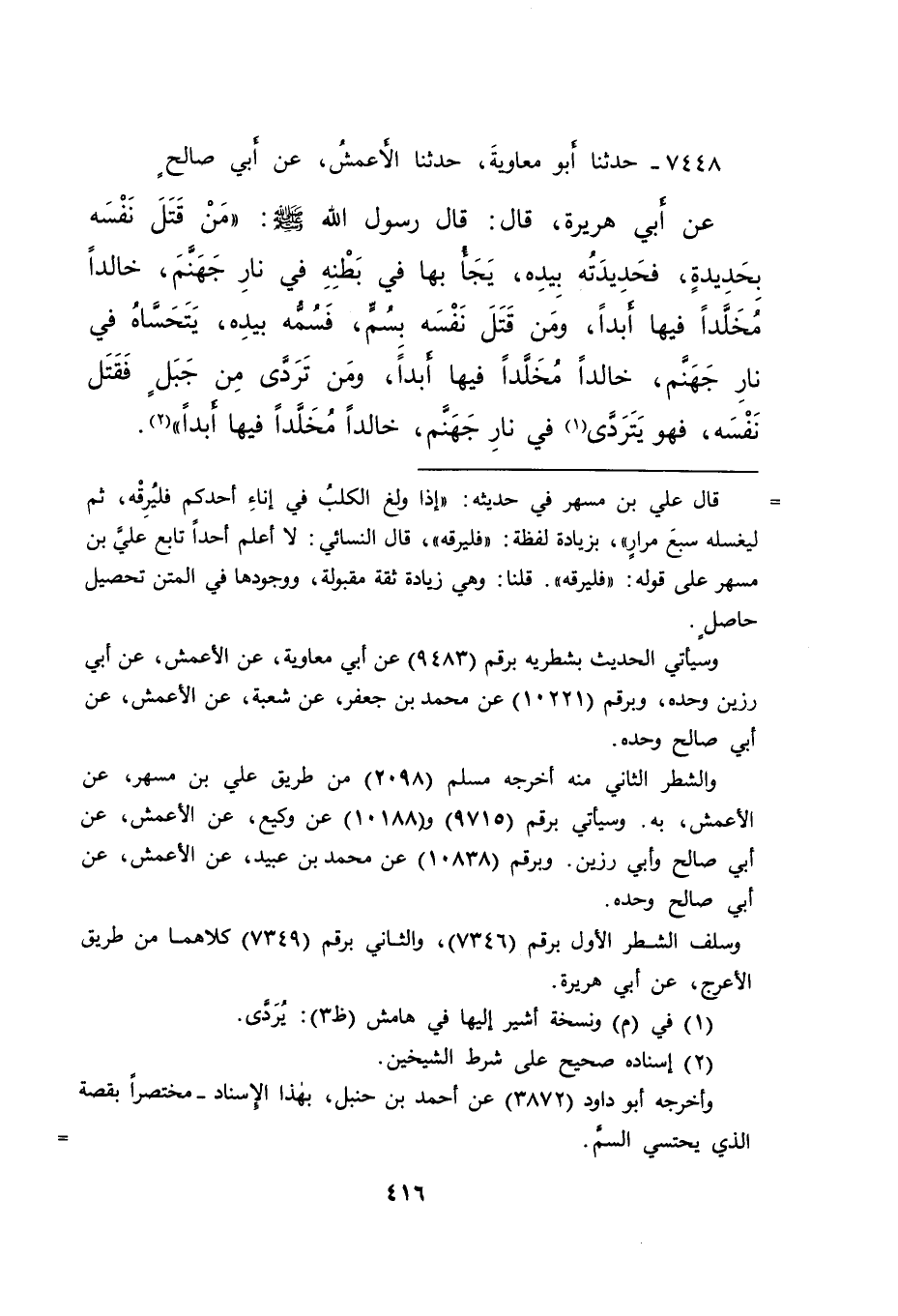 ٧٤٤٨ - حَدَّثَنَا أَبُو مُعَاوِيَةَ، حَدَّثَنَا الْأَعْمَشُ، عَنْ أَبِي صَالِحٍ، عَنْ أَبِي هُرَيْرَةَ، قَالَ: قَالَ رَسُولُ اللهِ صَلَّى اللهُ عَلَيْهِ وَسَلَّمَ: " مَنْ قَتَلَ نَفْسَهُ بِحَدِيدَةٍ، فَحَدِيدَتُهُ بِيَدِهِ، يَجَأُ بِهَا فِي بَطْنِهِ فِي نَارِ جَهَنَّمَ، خَالِدًا مُخَلَّدًا فِيهَا أَبَدًا، وَمَنْ قَتَلَ نَفْسَهُ بِسُمٍّ، فَسُمُّهُ بِيَدِهِ، يَتَحَسَّاهُ فِي نَارِ جَهَنَّمَ، خَالِدًا مُخَلَّدًا فِيهَا أَبَدًا، وَمَنْ تَرَدَّى مِنْ جَبَلٍ فَقَتَلَ نَفْسَهُ، فَهُوَ يَتَرَدَّى (١) فِي نَارِ جَهَنَّمَ، خَالِدًا مُخَلَّدًا فِيهَا أَبَدًا " (٢)