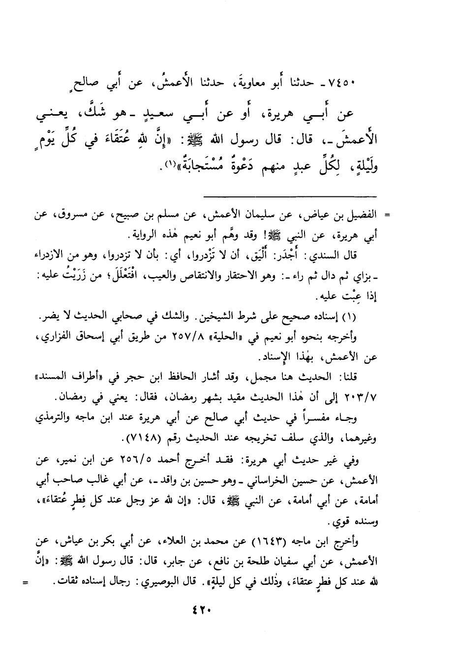٧٤٥٠ - حَدَّثَنَا أَبُو مُعَاوِيَةَ، حَدَّثَنَا الْأَعْمَشُ، عَنْ أَبِي صَالِحٍ، عَنْ أَبِي هُرَيْرَةَ، أَوْ عَنْ أَبِي سَعِيدٍ - هُوَ شَكَّ، يَعْنِي الْأَعْمَشَ -، قَالَ: قَالَ رَسُولُ اللهِ صَلَّى اللهُ عَلَيْهِ وَسَلَّمَ: " إِنَّ لِلَّهِ عُتَقَاءَ فِي كُلِّ يَوْمٍ وَلَيْلَةٍ، لِكُلِّ عَبْدٍ مِنْهُمْ دَعْوَةٌ مُسْتَجَابَةٌ " (١)