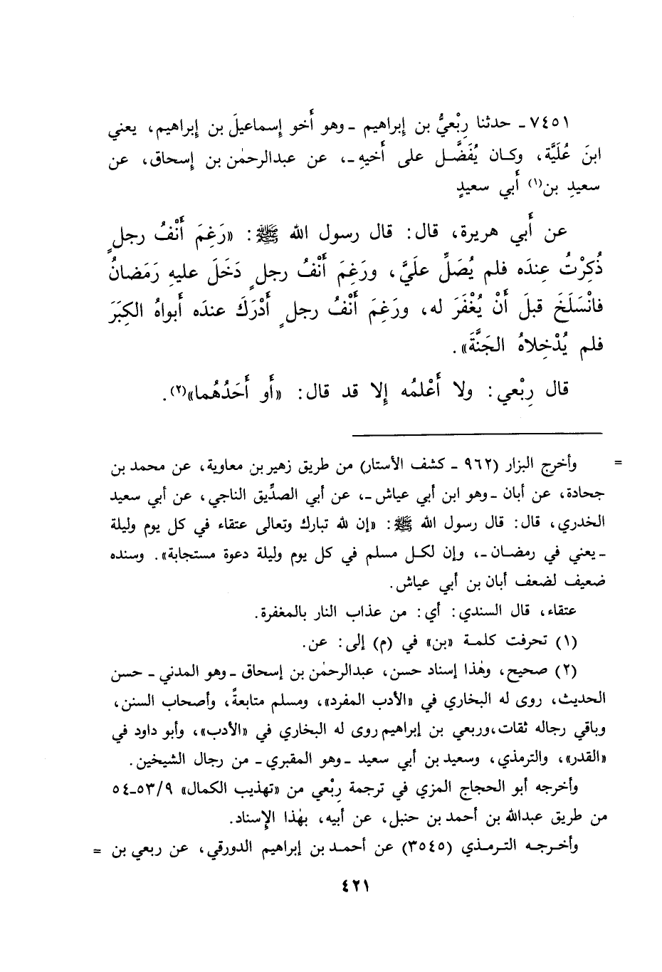 ٧٤٥١ - حَدَّثَنَا رِبْعِيُّ بْنُ إِبْرَاهِيمَ، " وَهُوَ أَخُو إِسْمَاعِيلَ بْنِ إِبْرَاهِيمَ يَعْنِي ابْنَ عُلَيَّةَ "، " وَكَانَ يُفَضَّلُ عَلَى أَخِيهِ "، عَنْ عَبْدِ الرَّحْمَنِ بْنِ إِسْحَاقَ، عَنْ سَعِيدِ بْنِ (١) أَبِي سَعِيدٍ، عَنْ أَبِي هُرَيْرَةَ، قَالَ: قَالَ رَسُولُ اللهِ صَلَّى اللهُ عَلَيْهِ وَسَلَّمَ: " رَغِمَ أَنْفُ رَجُلٍ ذُكِرْتُ عِنْدَهُ فَلَمْ يُصَلِّ عَلَيَّ، وَرَغِمَ أَنْفُ رَجُلٍ دَخَلَ عَلَيْهِ رَمَضَانُ فَانْسَلَخَ قَبْلَ أَنْ يُغْفَرَ لَهُ، وَرَغِمَ أَنْفُ رَجُلٍ أَدْرَكَ عِنْدَهُ أَبَوَاهُ الْكِبَرَ فَلَمْ يُدْخِلَاهُ الْجَنَّةَ " قَالَ رِبْعِيٌّ: وَلَا أَعْلَمُهُ إِلَّا قَدْ قَالَ: " أَوْ أَحَدُهُمَا " (٢)