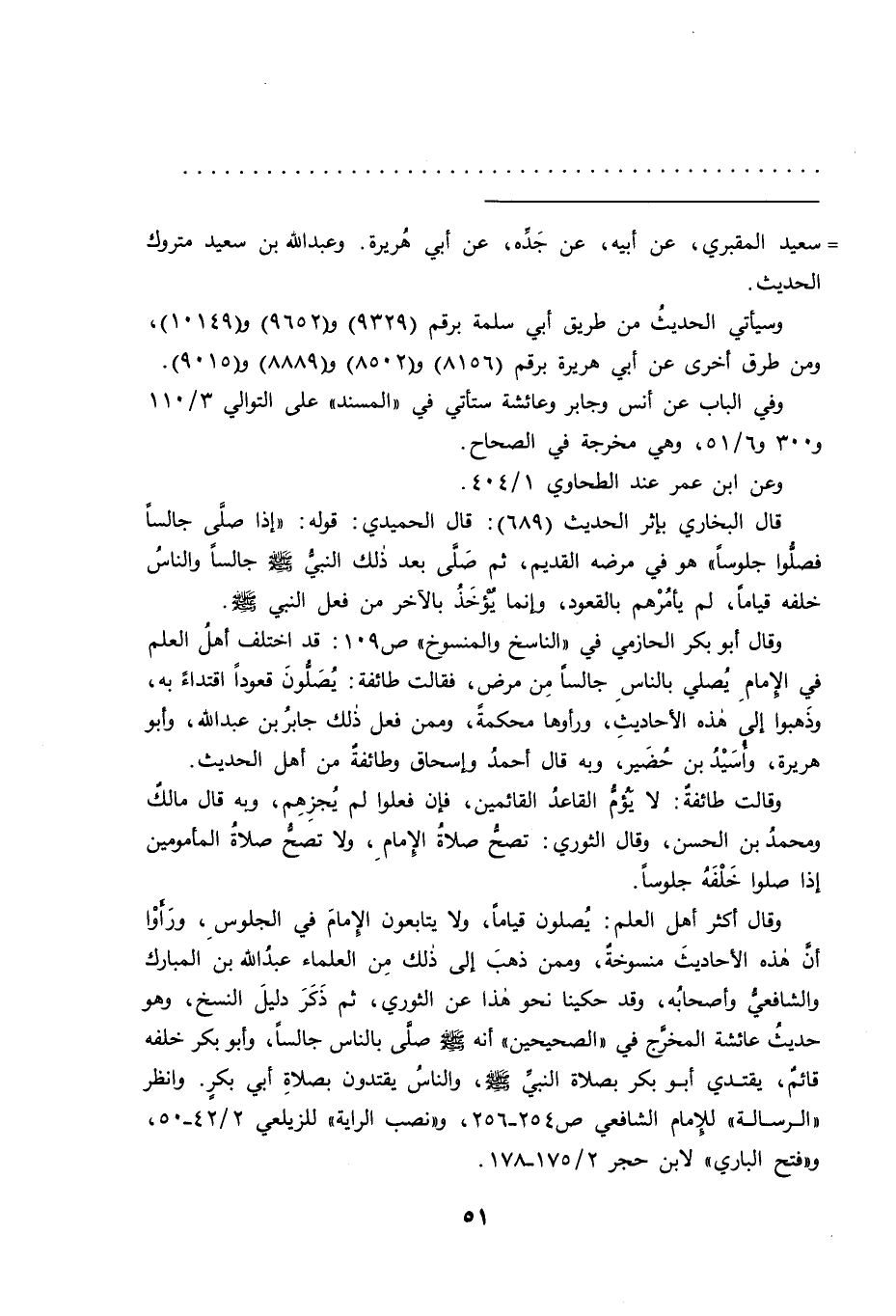 وقال أكثر أهل العلم: يصلون قياما، ولا يتابعون الإمام في الجلوس، ورأوا أن هذه الآحاديث منسوخةٌ، وممن ذهب إلى ذلك من العلماء عبد الله بن المبارك والشافعى وأصحابه، وقد حكينا نحو هذا عن الثوري، ثم ذكر دليل النسخ، وهو حديث عائشة المخرج في "الصحيحين" أنه صَلَّى اللهُ عَلَيْهِ وَسَلَّمَ صلى بالناس جالسا، وأبو بكر خلفه قائم، يقتدي أبو بكر بصلاة النبي صَلَّى اللهُ عَلَيْهِ وَسَلَّمَ، والناس يقتدون بصلاة أبي بكر. وانظر "الرسالة" للإمام الشافعي ص ٢٥٤-٢٥٦، و"نصب الراية" للزيلعي ٢/٤٢-٥٠، و"فتح الباري" لابن حجر ٢/١٧٥-١٧٨.