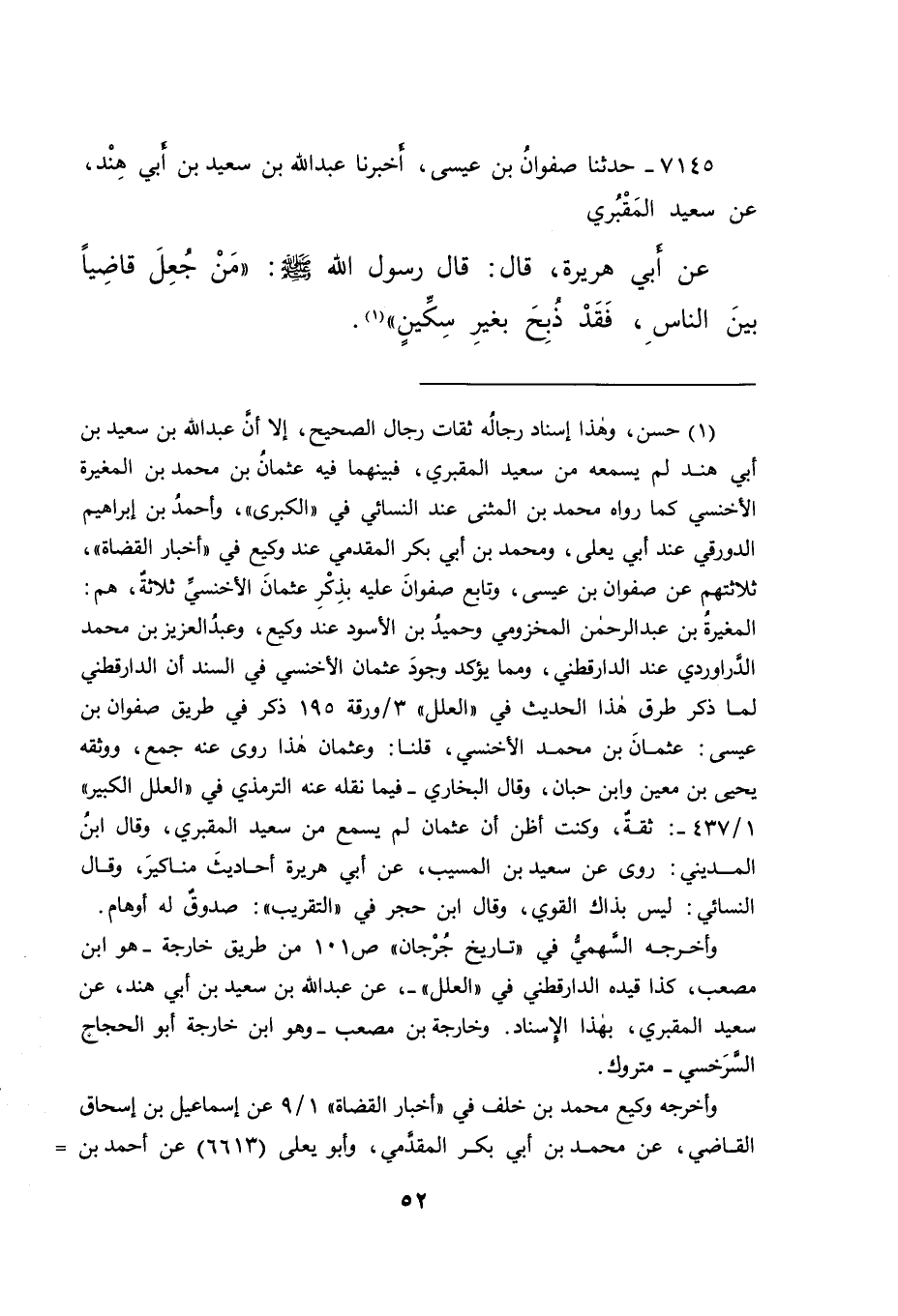 ٧١٤٥ - حَدَّثَنَا صَفْوَانُ بْنُ عِيسَى، أَخْبَرَنَا عَبْدُ اللهِ بْنُ سَعِيدِ بْنِ أَبِي هِنْدٍ، عَنْ سَعِيدٍ الْمَقْبُرِيِّ، عَنْ أَبِي هُرَيْرَةَ، قَالَ: قَالَ رَسُولُ اللهِ صَلَّى اللهُ عَلَيْهِ وَسَلَّمَ: " مَنْ جُعِلَ قَاضِيًا بَيْنَ النَّاسِ، فَقَدْ ذُبِحَ بِغَيْرِ سِكِّينٍ " (١)