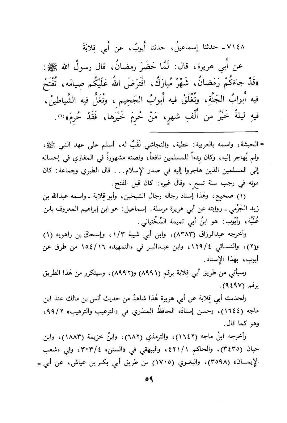 ٧١٤٨ - حَدَّثَنَا إِسْمَاعِيلُ، حَدَّثَنَا أَيُّوبُ، عَنْ أَبِي قِلَابَةَ، عَنْ أَبِي هُرَيْرَةَ، قَالَ: لَمَّا حَضَرَ رَمَضَانُ، قَالَ رَسُولُ اللهِ صَلَّى اللهُ عَلَيْهِ وَسَلَّمَ: " قَدْ جَاءَكُمْ رَمَضَانُ، شَهْرٌ مُبَارَكٌ، افْتَرَضَ اللهُ عَلَيْكُمْ صِيَامَهُ، تُفْتَحُ فِيهِ أَبْوَابُ الْجَنَّةِ، وَتُغْلَقُ فِيهِ أَبْوَابُ الْجَحِيمِ، وَتُغَلُّ فِيهِ الشَّيَاطِينُ، فِيهِ لَيْلَةٌ خَيْرٌ مِنْ أَلْفِ شَهْرٍ، مَنْ حُرِمَ خَيْرَهَا، فَقَدْ حُرِمَ " (١)
