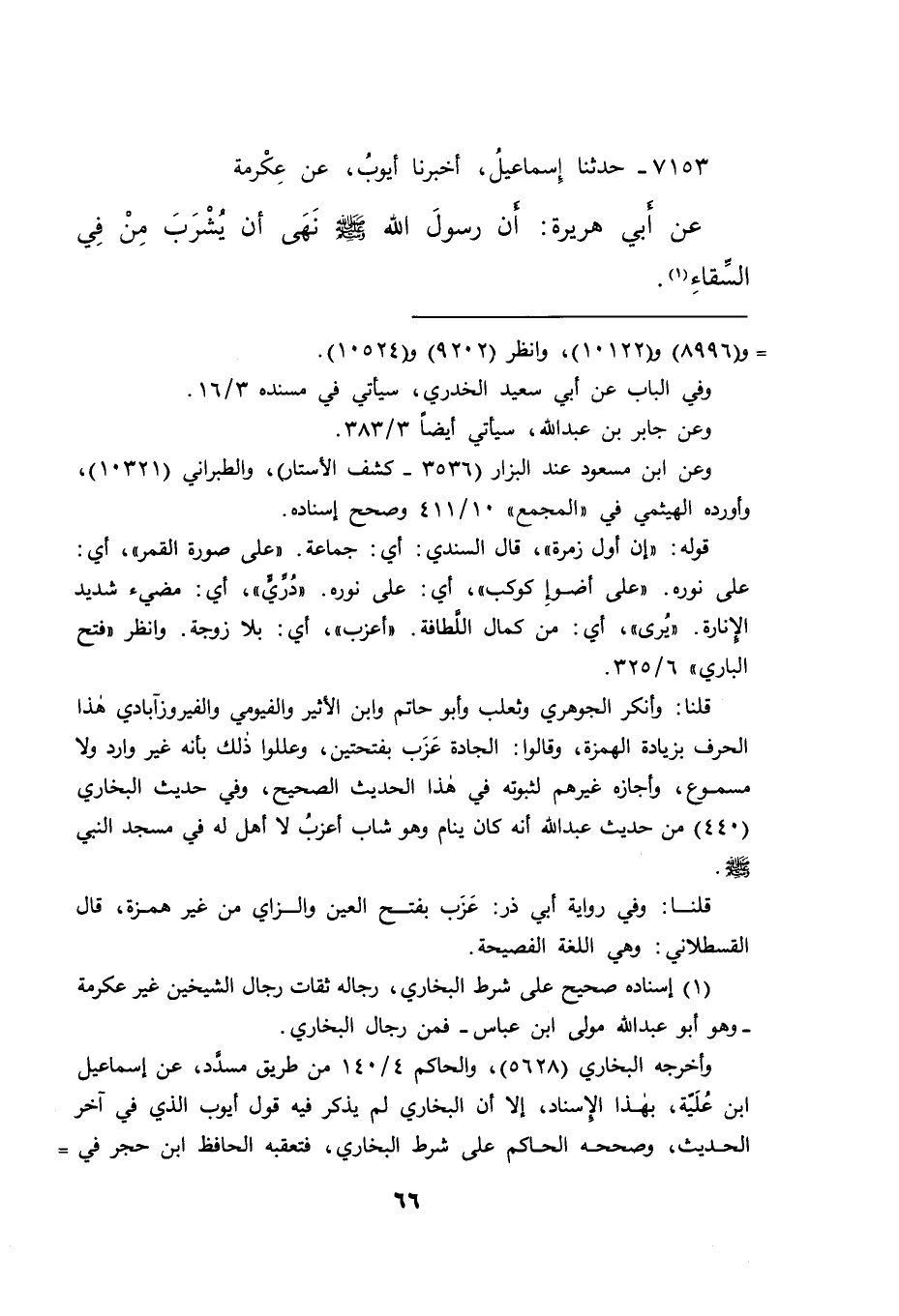 ٧١٥٣ - حَدَّثَنَا إِسْمَاعِيلُ، أَخْبَرَنَا أَيُّوبُ، عَنْ عِكْرِمَةَ، عَنْ أَبِي هُرَيْرَةَ: أَنَّ رَسُولَ اللهِ صَلَّى اللهُ عَلَيْهِ وَسَلَّمَ " نَهَى أَنْ يُشْرَبَ مِنْ فِي السِّقَاءِ " (١)