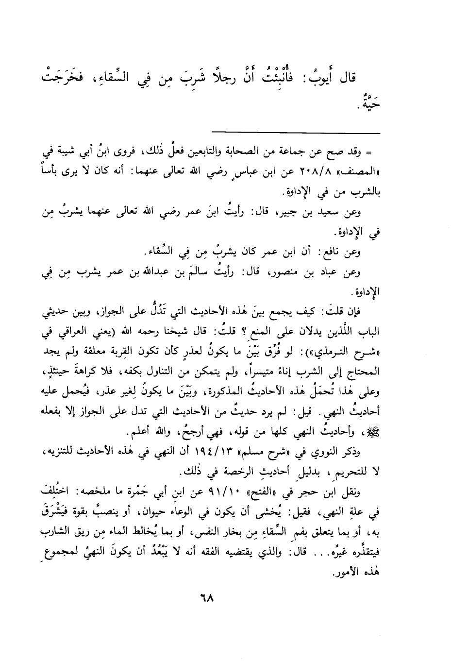 وعن عباد بن منصور، قال: رأيت سالم بن عبد الله بن عمر يشرب من في الإداوة.