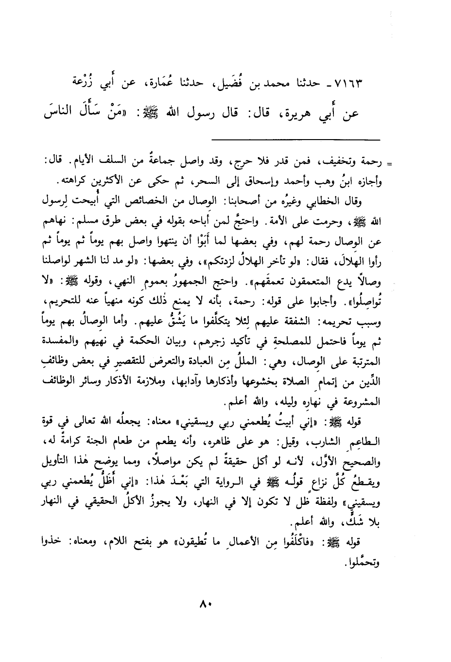 قوله صَلَّى اللهُ عَلَيْهِ وَسَلَّمَ: "إني أبيت يطعمني ربي ويسقيني" معناه: يجعله الله تعالى في قوة الطاعم الشارب، وقيل: هو على ظاهره، وأنه يطعم من طعام الجنة كرامة له، والصحيح الأول، لأنه لو أكل حقيقة لم يكن مواصلا، ومما يوضح هذا التأويل ويقطع كل نزاع قوله صَلَّى اللهُ عَلَيْهِ وَسَلَّمَ في الرواية التي بعد هذا: "إني أظل يطعمني ربي ويسقيني" ولفظة ظل لا تكون إلا في النهار، ولا يجوز الأكل الحقيقي في النهار بلا شك، والله أعلم.