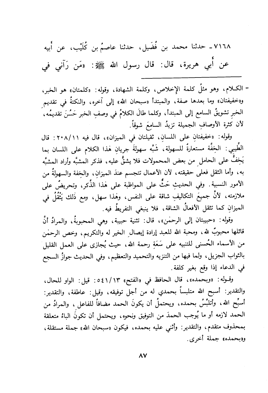 وقوله: "خفيفتان على اللسان، ثقيلتان في الميزان"، قال فيه ١١/٢٠٨: قال الطيبي: الخفة مستعارة للسهولة، شبه سهولة جريان هذا الكلام على اللسان بما يخف على الحامل من بعض المحمولات فلا يشق عليه، فذكر المشبه وأراد المشبه به، وأما الثقل فعلى حقيقته، لأن الأعمال تتجسم عند الميزان، والخفة والسهولة من الأمور النسبية. وفي الحديث حت على المواظبة على هذا الذكر، وتحريض على ملازمته، لأن جميع التكاليف شاقة على النفس، وهذا سهل، ومع ذلك يثقل في الميزان كما تثقل الأفعال الشاقة، فلا ينبغي التفريط فيه.