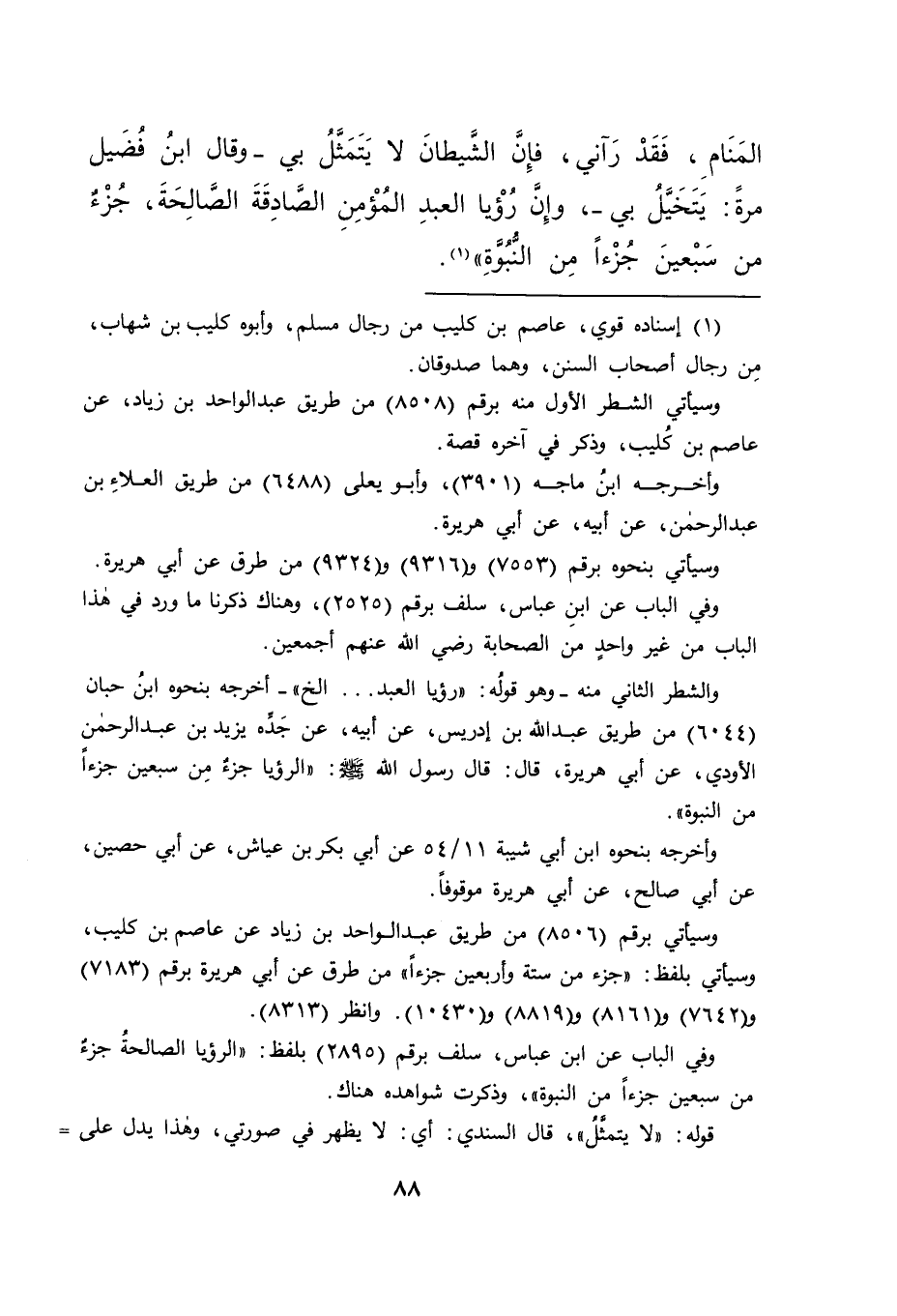 الْمَنَامِ، فَقَدْ رَآنِي، فَإِنَّ الشَّيْطَانَ لَا يَتَمَثَّلُ بِي - وَقَالَ ابْنُ فُضَيْلٍ مَرَّةً: يَتَخَيَّلُ بِي -، وَإِنَّ رُؤْيَا الْعَبْدِ الْمُؤْمِنِ الصَّادِقَةَ الصَّالِحَةَ، جُزْءٌ مِنْ سَبْعِينَ جُزْءًا مِنَ النُّبُوَّةِ " (١)