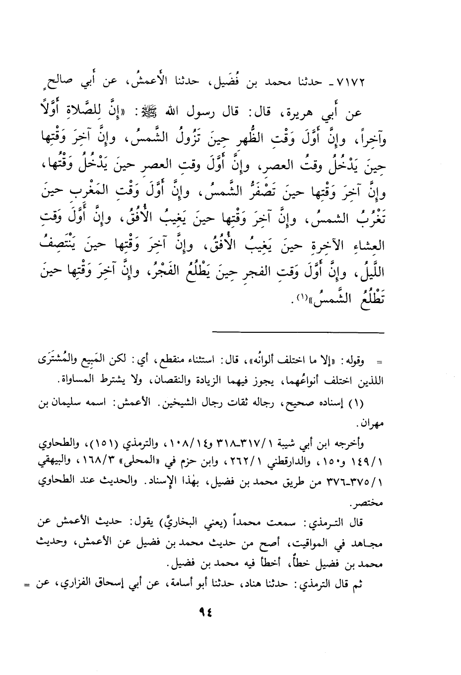 ٧١٧٢ - حَدَّثَنَا مُحَمَّدُ بْنُ فُضَيْلٍ، حَدَّثَنَا الْأَعْمَشُ، عَنْ أَبِي صَالِحٍ، عَنْ أَبِي هُرَيْرَةَ، قَالَ: قَالَ رَسُولُ اللهِ صَلَّى اللهُ عَلَيْهِ وَسَلَّمَ: " إِنَّ لِلصَّلَاةِ أَوَّلًا وَآخِرًا، وَإِنَّ أَوَّلَ وَقْتِ الظُّهْرِ حِينَ تَزُولُ الشَّمْسُ، وَإِنَّ آخِرَ وَقْتِهَا حِينَ يَدْخُلُ وَقْتُ الْعَصْرِ، وَإِنَّ أَوَّلَ وَقْتِ الْعَصْرِ حِينَ يَدْخُلُ وَقْتُهَا، وَإِنَّ آخِرَ وَقْتِهَا حِينَ تَصْفَرُّ الشَّمْسُ، وَإِنَّ أَوَّلَ وَقْتِ الْمَغْرِبِ حِينَ تَغْرُبُ الشَّمْسُ، وَإِنَّ آخِرَ وَقْتِهَا حِينَ يَغِيبُ الْأُفُقُ، وَإِنَّ أَوَّلَ وَقْتِ الْعِشَاءِ الْآخِرَةِ حِينَ يَغِيبُ الْأُفُقُ، وَإِنَّ آخِرَ وَقْتِهَا حِينَ يَنْتَصِفُ اللَّيْلُ، وَإِنَّ أَوَّلَ وَقْتِ الْفَجْرِ حِينَ يَطْلُعُ الْفَجْرُ، وَإِنَّ آخِرَ وَقْتِهَا حِينَ تَطْلُعُ الشَّمْسُ " (١)
