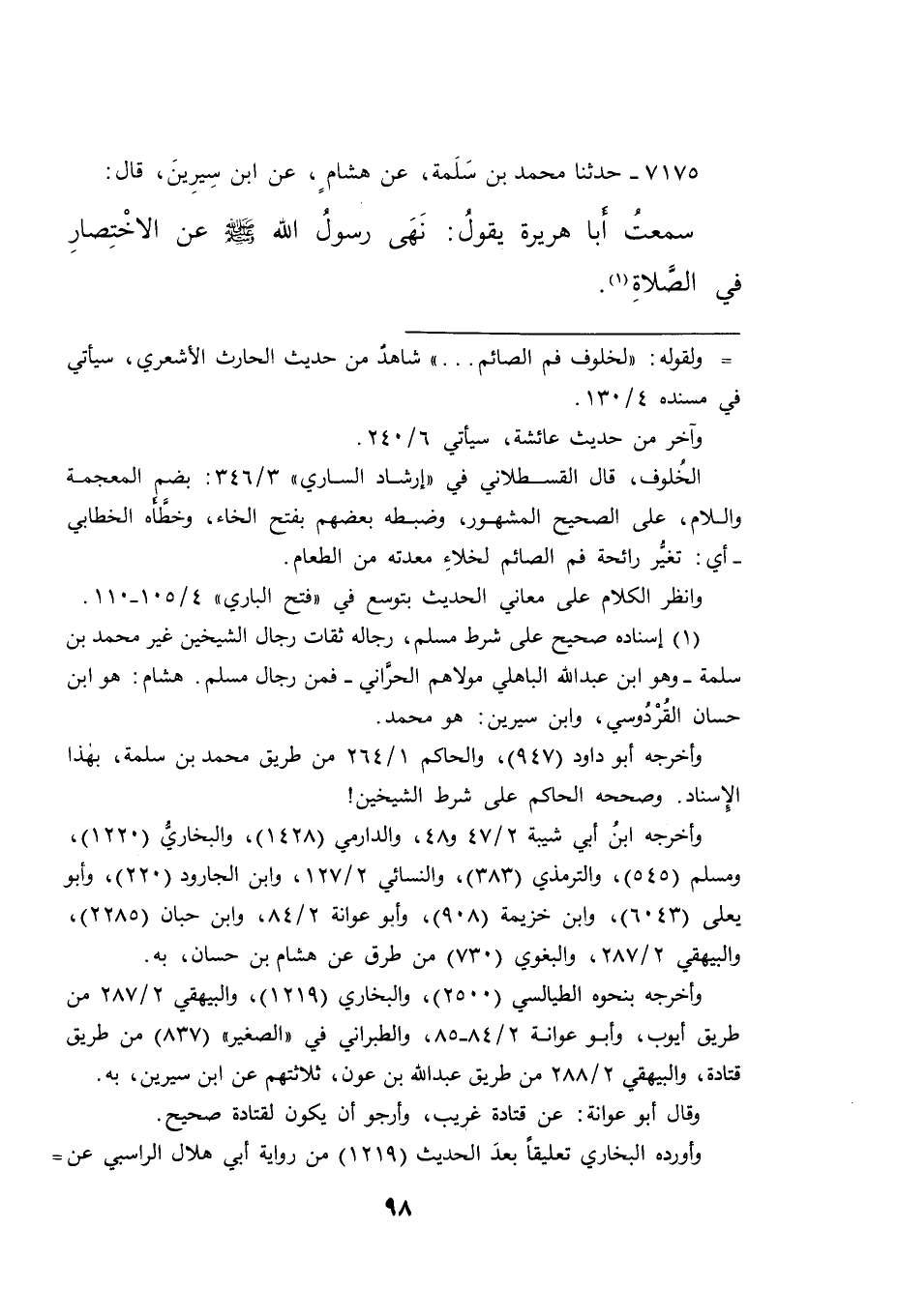 ٧١٧٥ - حَدَّثَنَا مُحَمَّدُ بْنُ سَلَمَةَ، عَنْ هِشَامٍ، عَنِ ابْنِ سِيرِينَ، قَالَ: سَمِعْتُ أَبَا هُرَيْرَةَ، يَقُولُ: " نَهَى رَسُولُ اللهِ صَلَّى اللهُ عَلَيْهِ وَسَلَّمَ عَنِ الِاخْتِصَارِ فِي الصَّلَاةِ " (١)