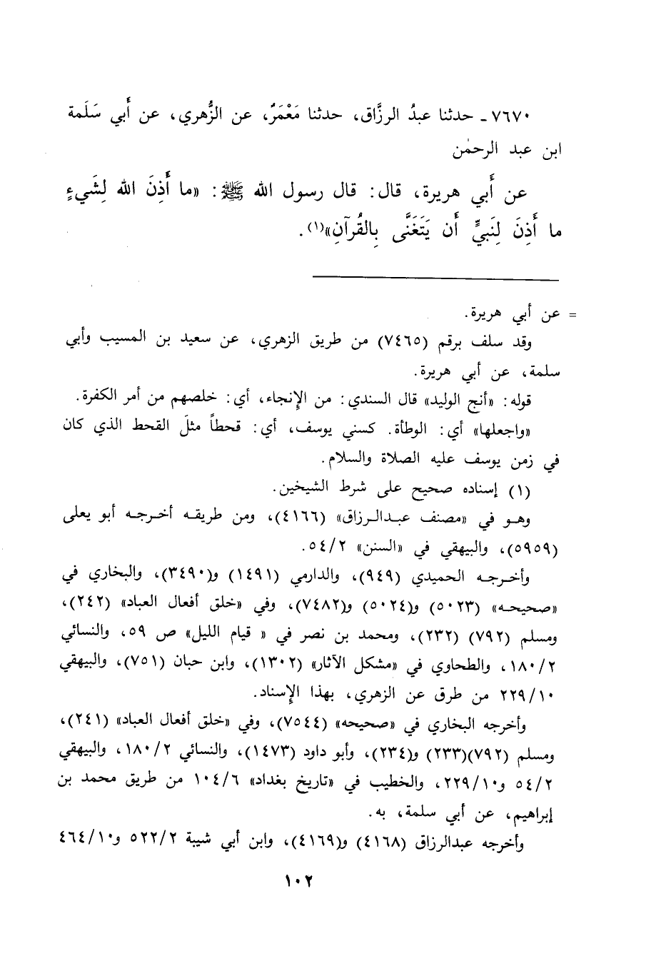 ٧٦٧٠ - حَدَّثَنَا عَبْدُ الرَّزَّاقِ، حَدَّثَنَا مَعْمَرٌ، عَنِ الزُّهْرِيِّ، عَنْ أَبِي سَلَمَةَ بْنِ عَبْدِ الرَّحْمَنِ، عَنْ أَبِي هُرَيْرَةَ، قَالَ: قَالَ رَسُولُ اللهِ صَلَّى اللهُ عَلَيْهِ وَسَلَّمَ: " مَا أَذِنَ اللهُ لِشَيْءٍ مَا أَذِنَ لِنَبِيٍّ أَنْ يَتَغَنَّى بِالْقُرْآنِ " (١)