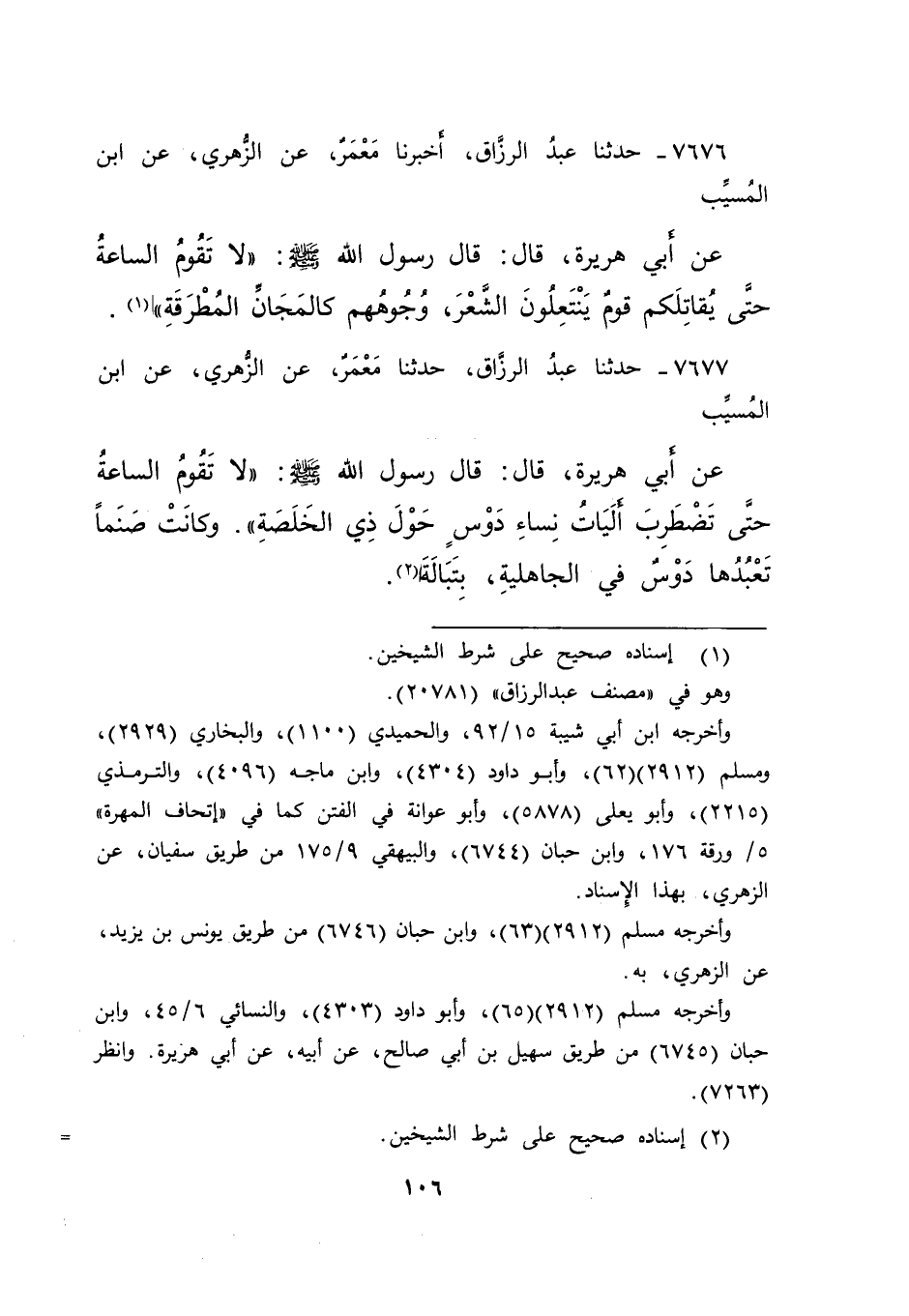 ٧٦٧٦ - حَدَّثَنَا عَبْدُ الرَّزَّاقِ، أَخْبَرَنَا مَعْمَرٌ، عَنِ الزُّهْرِيِّ، عَنِ ابْنِ الْمُسَيِّبِ، عَنْ أَبِي هُرَيْرَةَ، قَالَ: قَالَ رَسُولُ اللهِ صَلَّى اللهُ عَلَيْهِ وَسَلَّمَ: " لَا تَقُومُ السَّاعَةُ حَتَّى يُقَاتِلَكُمْ قَوْمٌ يَنْتَعِلُونَ الشَّعْرَ، وُجُوهُهُمْ كَالْمَجَانِّ الْمُطْرَقَةِ " (١)