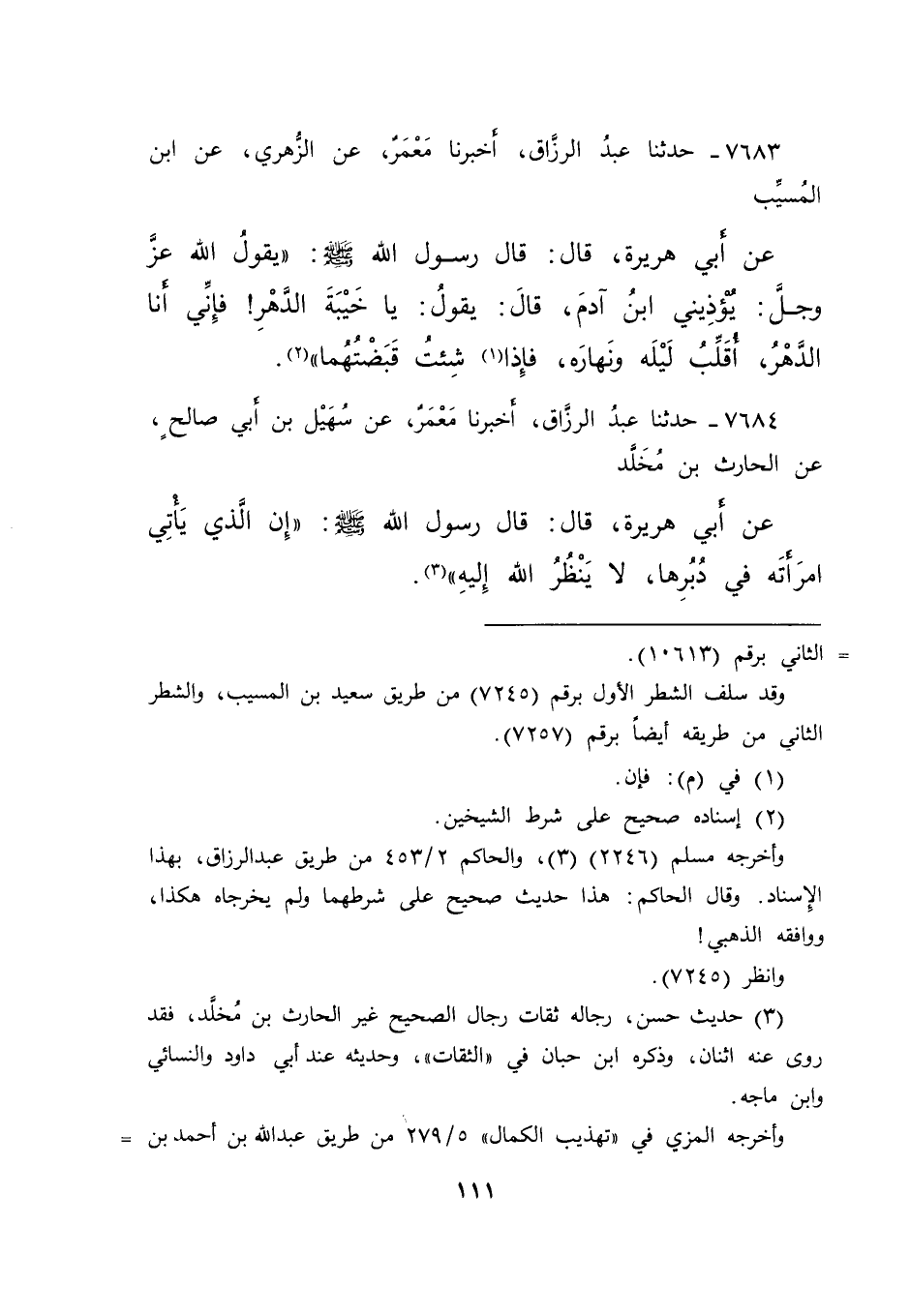 ٧٦٨٤ - حَدَّثَنَا عَبْدُ الرَّزَّاقِ، أَخْبَرَنَا مَعْمَرٌ، عَنْ سُهَيْلِ بْنِ أَبِي صَالِحٍ، عَنِ الْحَارِثِ بْنِ مُخَلَّدٍ، عَنْ أَبِي هُرَيْرَةَ، قَالَ: قَالَ رَسُولُ اللهِ صَلَّى اللهُ عَلَيْهِ وَسَلَّمَ: " إِنَّ الَّذِي يَأْتِي امْرَأَتَهُ فِي دُبُرِهَا، لَا يَنْظُرُ اللهُ إِلَيْهِ " (٣)