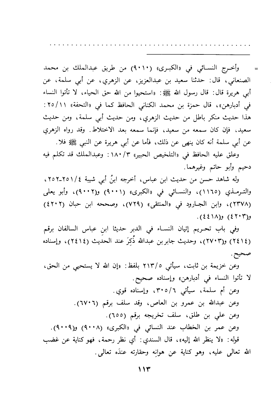= وأخرج النسائي في "الكبرى" (٩٠١٠) من طريق عبد الملك بن محمد الصنعاني، قال: حدثنا سعيد بن عبد العزيز، عن الزهري، عن أبي سلمة، عن أبي هريرة قال: قال رسول الله صَلَّى اللهُ عَلَيْهِ وَسَلَّمَ: "استحيوا من الله حق الحياء، لا تأتوا النساء في أدبارهن"، قال حمزة بن محمد الكناني الحافظ كما في "التحفة" ١١/٢٥: هذا حديث منكر باطل من حديث الزهري، ومن حديث أبي سلمة، ومن حديث سعيد، فإن كان سمعه من سعيد، فإنما سمعه بعد الاختلاط. وقد رواه الزهري عن أبي سلمة أنه كان ينهى عن ذلك، فأما عن أبي هريرة عن النبي صَلَّى اللهُ عَلَيْهِ وَسَلَّمَ فلا.