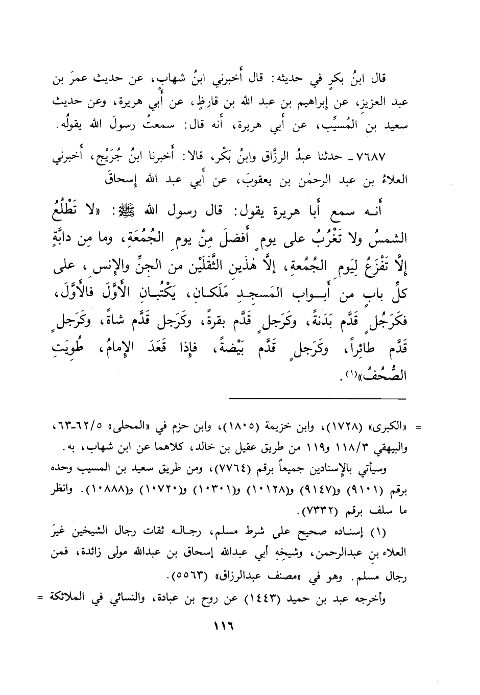٧٦٨٧ - حَدَّثَنَا عَبْدُ الرَّزَّاقِ، وَابْنُ بَكْرٍ، قَالَا: أَخْبَرَنَا ابْنُ جُرَيْجٍ، أَخْبَرَنِي الْعَلَاءُ بْنُ عَبْدِ الرَّحْمَنِ بْنِ يَعْقُوبَ، عَنْ أَبِي عَبْدِ اللهِ إِسْحَاقَ، أَنَّهُ سَمِعَ أَبَا هُرَيْرَةَ، يَقُولُ: قَالَ رَسُولُ اللهِ صَلَّى اللهُ عَلَيْهِ وَسَلَّمَ: " لَا تَطْلُعُ الشَّمْسُ وَلَا تَغْرُبُ عَلَى يَوْمٍ أَفْضَلَ مِنْ يَوْمِ الْجُمُعَةِ، وَمَا مِنْ دَابَّةٍ إِلَّا تَفْزَعُ لِيَوْمِ الْجُمُعَةِ، إِلَّا هَذَيْنِ الثَّقَلَيْنِ مِنَ الْجِنِّ وَالْإِنْسِ، عَلَى كُلِّ بَابٍ مِنْ أَبْوَابِ الْمَسْجِدِ مَلَكَانِ، يَكْتُبَانِ الْأَوَّلَ فَالْأَوَّلَ، فَكَرَجُلٍ قَدَّمَ بَدَنَةً، وَكَرَجُلٍ قَدَّمَ بَقَرَةً، وَكَرَجُلٍ قَدَّمَ شَاةً، وَكَرَجُلٍ قَدَّمَ طَائِرًا، وَكَرَجُلٍ قَدَّمَ بَيْضَةً، فَإِذَا قَعَدَ الْإِمَامُ، طُوِيَتْ الصُّحُفُ " (١)
