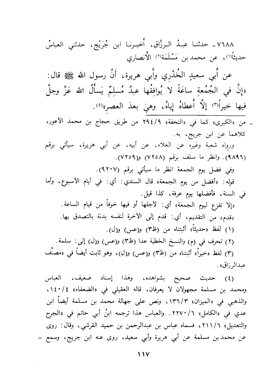 ٧٦٨٨ - حَدَّثَنَا عَبْدُ الرَّزَّاقِ، أَخْبَرَنَا ابْنُ جُرَيْجٍ، حَدَّثَنِي الْعَبَّاسُ حديثاً (١) عَنْ مُحَمَّدِ بْنِ مَسْلَمَةَ (٢) الْأَنْصَارِيِّ، عَنْ أَبِي سَعِيدٍ الْخُدْرِيِّ، وَأَبِي هُرَيْرَةَ: أَنَّ رَسُولَ اللهِ صَلَّى اللهُ عَلَيْهِ وَسَلَّمَ قَالَ: " إِنَّ فِي الْجُمُعَةِ سَاعَةً لَا يُوَافِقُهَا عَبْدٌ مُسْلِمٌ يَسْأَلُ اللهَ عَزَّ وَجَلَّ فِيهَا خَيْرًا (٣) إِلَّا أَعْطَاهُ إِيَّاهُ، وَهِيَ بَعْدَ الْعَصْرِ " (٤)
