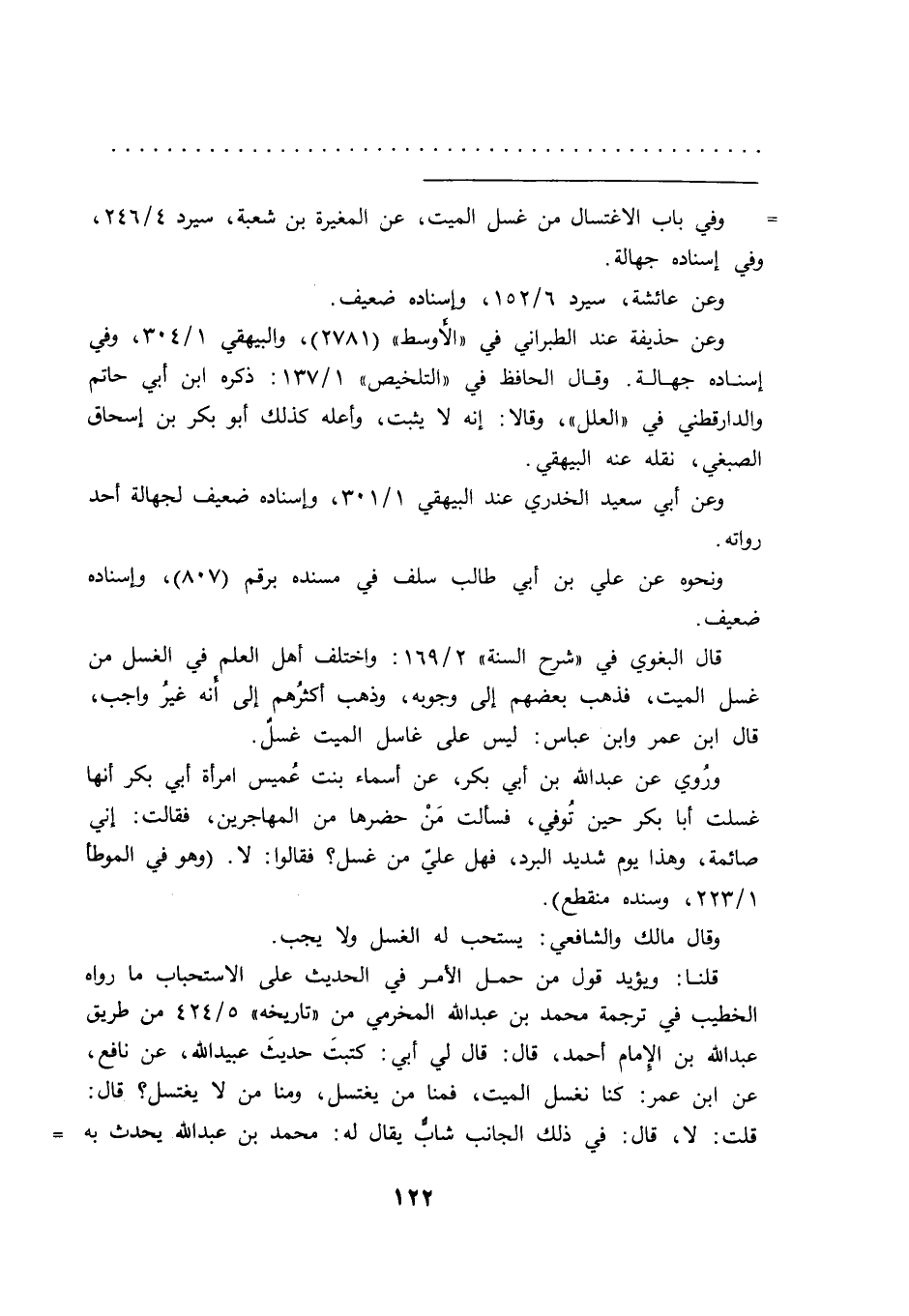 قلنا: ويؤيد قول من حمل الأمر في الحديث على الاستحباب ما رواه الخطيب في ترجمة محمد بن عبد الله المخرمي من "تاريخه" ٥/٤٢٤ من طريق عبد الله بن الإِمام أحمد، قال: قال لي أبي: كتبتَ حديثَ عبيد الله، عن نافع، عن ابن عمر: كنا نغسل الميت، فمنا من يغتسل، ومنا من لا يغتسل؟ قال: قلت: لا، قال: في ذلك الجانب شابٌّ يقال له: محمد بن عبد الله يحدث به=