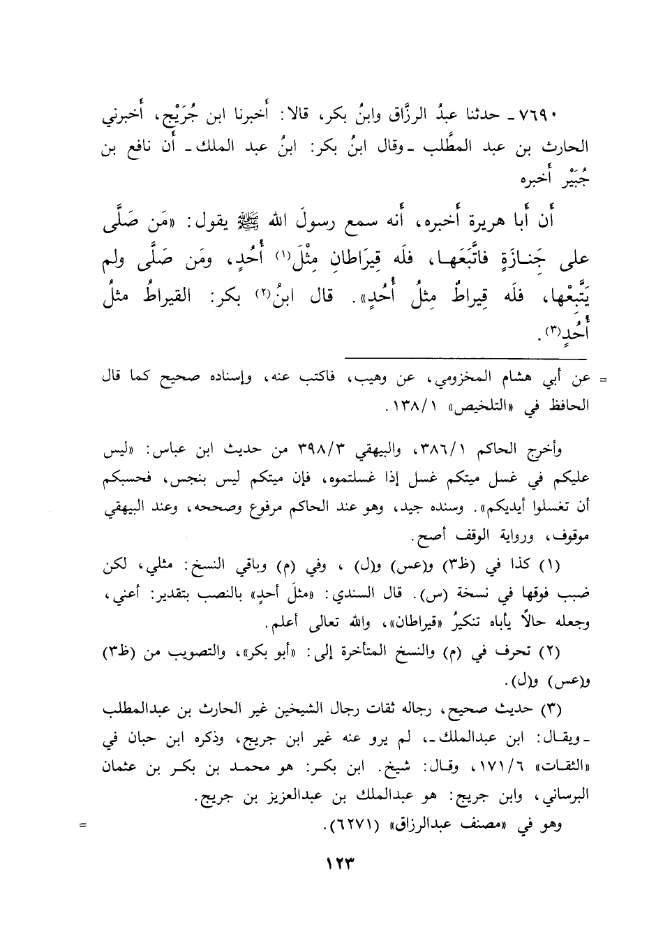 ٧٦٩٠ - حَدَّثَنَا عَبْدُ الرَّزَّاقِ، وَابْنُ بَكْرٍ، قَالَا: أَخْبَرَنَا ابْنُ جُرَيْجٍ، أَخْبَرَنِي الْحَارِثُ بْنُ عَبْدِ الْمُطَّلِبِ، وَقَالَ ابْنُ بَكْرٍ: ابْنُ عَبْدِ الْمَلِكِ، أَنَّ نَافِعَ بْنَ جُبَيْرٍ، أَخْبَرَهُ، أَنَّ أَبَا هُرَيْرَةَ، أَخْبَرَهُ، أَنَّهُ سَمِعَ رَسُولَ اللهِ صَلَّى اللهُ عَلَيْهِ وَسَلَّمَ يَقُولُ: " مَنْ صَلَّى عَلَى جَنَازَةٍ فَاتَّبَعَهَا، فَلَهُ قِيرَاطَانِ مِثْلُ (١) أُحُدٍ، وَمَنْ صَلَّى وَلَمْ يَتْبَعْهَا، فَلَهُ قِيرَاطٌ مِثْلُ أُحُدٍ " قَالَ ابْنُ (٢) بَكْرٍ: الْقِيرَاطُ مِثْلُ أُحُدٍ (٣)