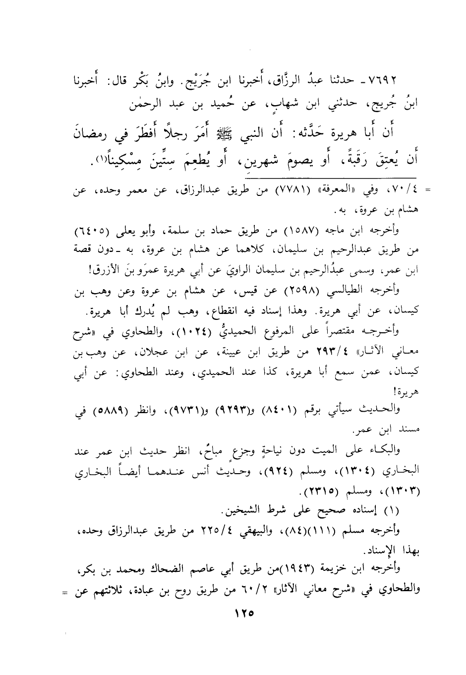 ٧٦٩٢ - حَدَّثَنَا عَبْدُ الرَّزَّاقِ، أَخْبَرَنَا ابْنُ جُرَيْجٍ، وَابْنُ بَكْرٍ، قَالَ: أَخْبَرَنَا ابْنُ جُرَيْجٍ، حَدَّثَنِي ابْنُ شِهَابٍ، عَنْ حُمَيْدِ بْنِ عَبْدِ الرَّحْمَنِ، أَنَّ أَبَا هُرَيْرَةَ، حَدَّثَهُ: أَنَّ النَّبِيَّ صَلَّى اللهُ عَلَيْهِ وَسَلَّمَ: " أَمَرَ رَجُلًا أَفْطَرَ فِي رَمَضَانَ أَنْ يُعْتِقَ رَقَبَةً، أَوْ يَصُومَ شَهْرَيْنِ، أَوْ يُطْعِمَ سِتِّينَ مِسْكِينًا " (١)