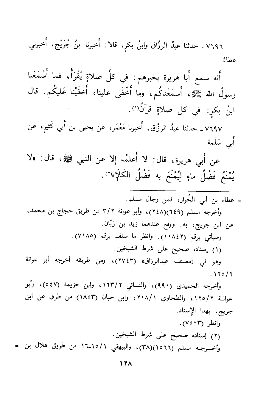 ٧٦٩٦ - حَدَّثَنَا عَبْدُ الرَّزَّاقِ، وَابْنُ بَكْرٍ، قَالَا: أَخْبَرَنَا ابْنُ جُرَيْجٍ، أَخْبَرَنِي عَطَاءٌ، أَنَّهُ سَمِعَ أَبَا هُرَيْرَةَ، يُخْبِرُهُمْ: " فِي كُلِّ صَلَاةٍ يُقْرَأُ، فَمَا أَسْمَعَنَا رَسُولُ اللهِ صَلَّى اللهُ عَلَيْهِ وَسَلَّمَ، أَسْمَعْنَاكُمْ، وَمَا أَخْفَى عَلَيْنَا، أَخْفَيْنَا عَلَيْكُمْ " قَالَ ابْنُ بَكْرٍ: فِي كُلِّ صَلَاةٍ قُرْآنٌ (١)