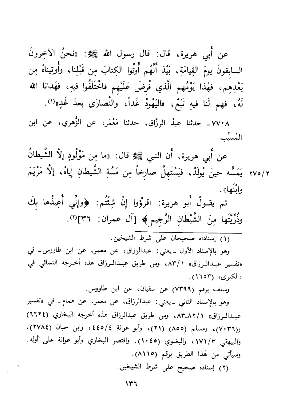 ٧٧٠٨ - حَدَّثَنَا عَبْدُ الرَّزَّاقِ، حَدَّثَنَا مَعْمَرٌ، عَنِ الزُّهْرِيِّ، عَنِ ابْنِ الْمُسَيِّبِ، عَنْ أَبِي هُرَيْرَةَ، أَنَّ النَّبِيَّ صَلَّى اللهُ عَلَيْهِ وَسَلَّمَ قَالَ: " مَا مِنْ مَوْلُودٍ إِلَّا الشَّيْطَانُ يَمَسُّهُ حِينَ يُولَدُ، فَيَسْتَهِلُّ صَارِخًا مِنْ مَسَّةِ الشَّيْطَانِ إِيَّاهُ، إِلَّا مَرْيَمَ وَابْنَهَا " ثُمَّ يَقُولُ أَبُو هُرَيْرَةَ: " اقْرَءُوا إِنْ شِئْتُمْ: {وَإِنِّي أُعِيذُهَا بِكَ وَذُرِّيَّتَهَا مِنَ الشَّيْطَانِ الرَّجِيمِ} [آل عمران: ٣٦] " (٢)
