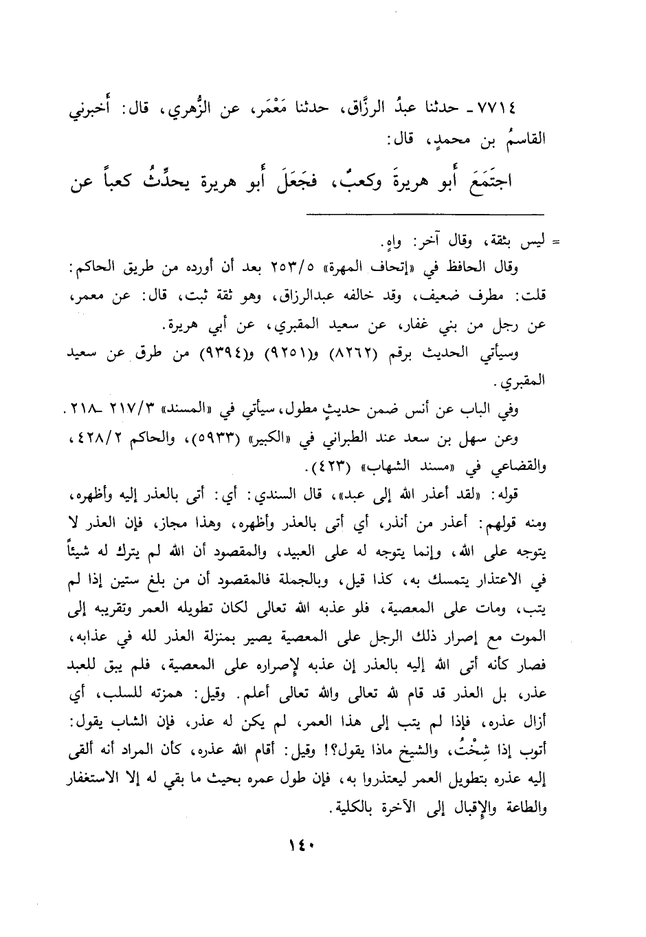 ٧٧١٤ - حَدَّثَنَا عَبْدُ الرَّزَّاقِ، حَدَّثَنَا مَعْمَرٌ، عَنِ الزُّهْرِيِّ، قَالَ: أَخْبَرَنِي الْقَاسِمُ بْنُ مُحَمَّدٍ، قَالَ: - اجْتَمَعَ أَبُو هُرَيْرَةَ وَكَعْبٌ، فَجَعَلَ أَبُو هُرَيْرَةَ، يُحَدِّثُ كَعْبًا عَنِ