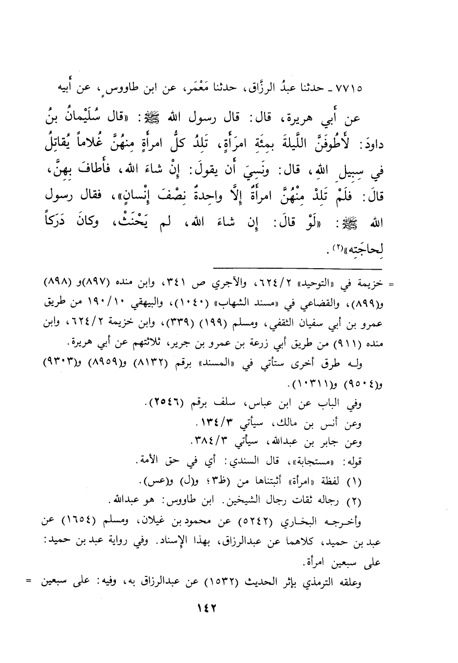 ٧٧١٥ - حَدَّثَنَا عَبْدُ الرَّزَّاقِ، حَدَّثَنَا مَعْمَرٌ، عَنِ ابْنِ طَاوُسٍ، عَنْ أَبِيهِ، عَنْ أَبِي هُرَيْرَةَ، قَالَ: قَالَ رَسُولُ اللهِ صَلَّى اللهُ عَلَيْهِ وَسَلَّمَ: " قَالَ سُلَيْمَانُ بْنُ دَاوُدَ: لَأَطُوفَنَّ اللَّيْلَةَ بِمِائَةِ امْرَأَةٍ، تَلِدُ كُلُّ امْرَأَةٍ مِنْهُنَّ غُلَامًا يُقَاتِلُ فِي سَبِيلِ اللهِ "، قَالَ: " وَنَسِيَ أَنْ يَقُولَ: إِنْ شَاءَ اللهُ، فَأَطَافَ بِهِنَّ "، قَالَ: " فَلَمْ تَلِدْ مِنْهُنَّ امْرَأَةٌ (١) إِلَّا وَاحِدَةٌ نِصْفَ إِنْسَانٍ "، فَقَالَ رَسُولُ اللهِ صَلَّى اللهُ عَلَيْهِ وَسَلَّمَ: " لَوْ قَالَ: إِنْ شَاءَ اللهُ، لَمْ يَحْنَثْ، وَكَانَ دَرَكًا لِحَاجَتِهِ " (٢)