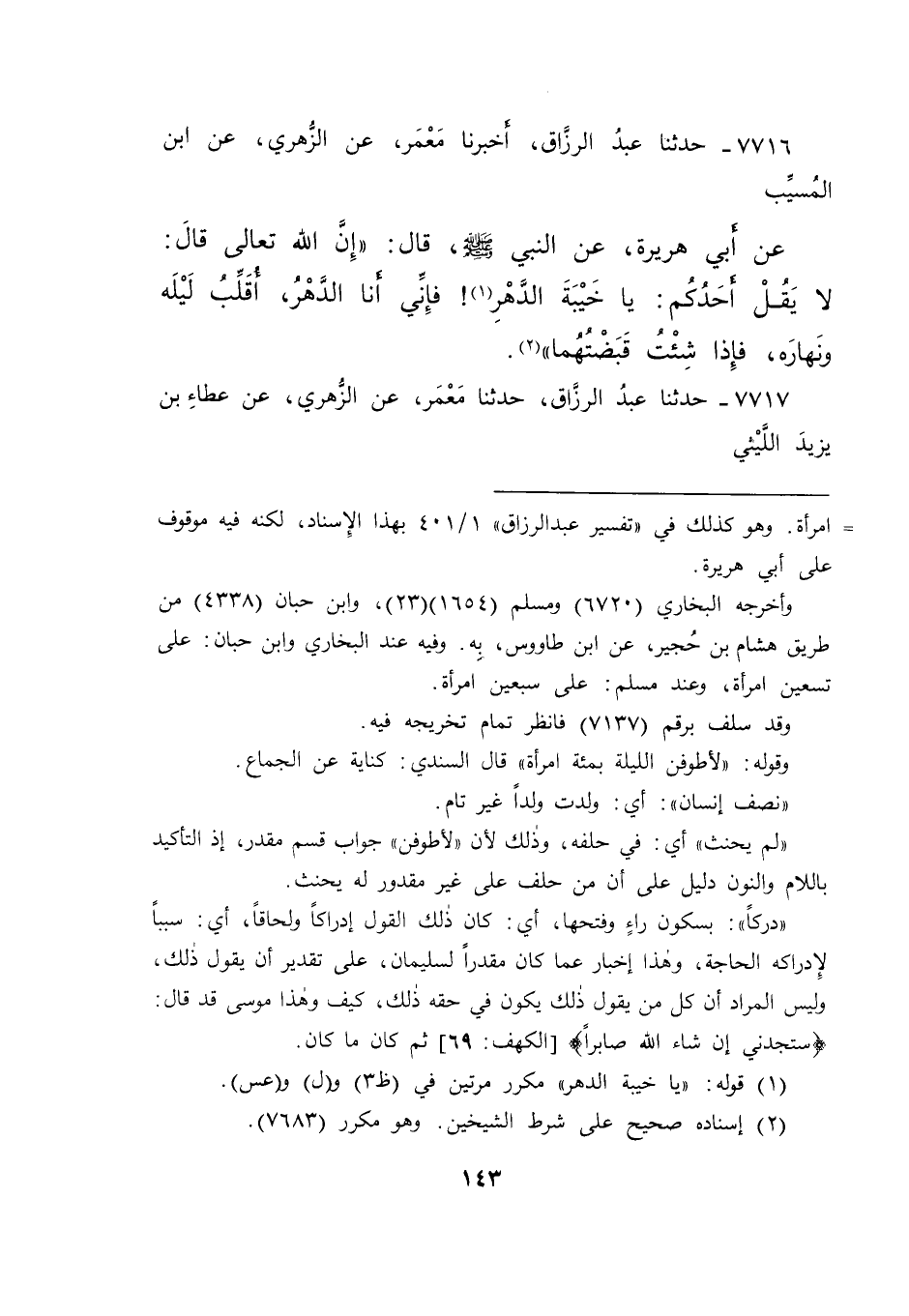 ٧٧١٦ - حَدَّثَنَا عَبْدُ الرَّزَّاقِ، أَخْبَرَنَا مَعْمَرٌ، عَنِ الزُّهْرِيِّ، عَنِ ابْنِ الْمُسَيِّبِ، عَنْ أَبِي هُرَيْرَةَ، عَنِ النَّبِيِّ صَلَّى اللهُ عَلَيْهِ وَسَلَّمَ قَالَ: " إِنَّ اللهَ تَعَالَى قَالَ: لَا يَقُلْ أَحَدُكُمْ: يَا خَيْبَةَ الدَّهْرِ (١) فَإِنِّي أَنَا الدَّهْرُ، أُقَلِّبُ لَيْلَهُ وَنَهَارَهُ، فَإِذَا شِئْتُ قَبَضْتُهُمَا " (٢)