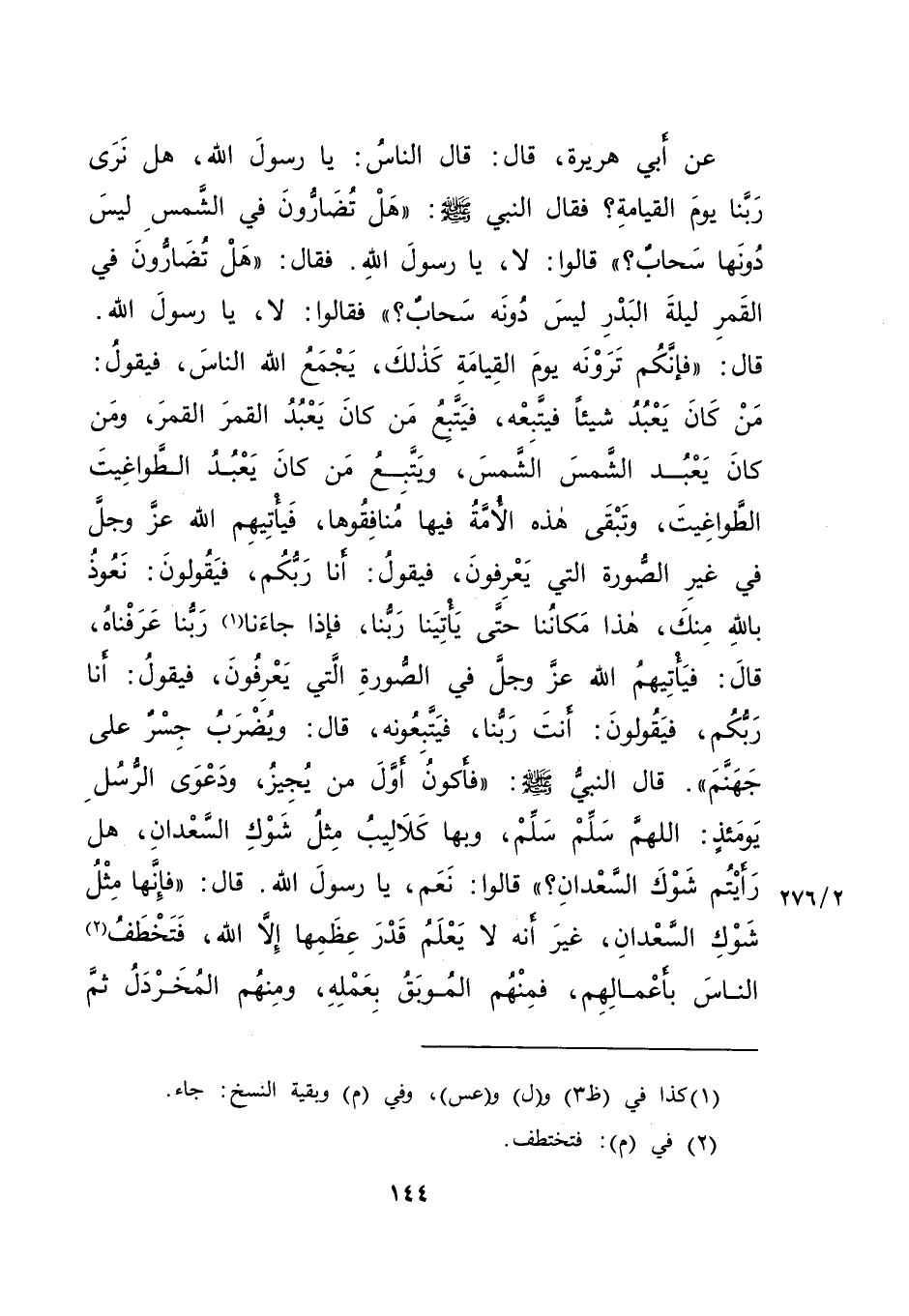 عَنْ أَبِي هُرَيْرَةَ، قَالَ: قَالَ النَّاسُ: يَا رَسُولَ اللهِ، هَلْ نَرَى رَبَّنَا يَوْمَ الْقِيَامَةِ؟ فَقَالَ النَّبِيُّ صَلَّى اللهُ عَلَيْهِ وَسَلَّمَ: " هَلْ تُضَارُّونَ فِي الشَّمْسِ لَيْسَ دُونَهَا سَحَابٌ؟ " قَالُوا: لَا، يَا رَسُولَ اللهِ. فَقَالَ: " هَلْ تُضَارُّونَ فِي الْقَمَرِ لَيْلَةَ الْبَدْرِ لَيْسَ دُونَهُ سَحَابٌ؟ " فَقَالُوا: لَا، يَا رَسُولَ اللهِ. قَالَ: " فَإِنَّكُمْ تَرَوْنَهُ يَوْمَ الْقِيَامَةِ كَذَلِكَ، يَجْمَعُ اللهُ النَّاسَ، فَيَقُولُ: مَنْ كَانَ يَعْبُدُ شَيْئًا فَيَتْبَعُهُ، فَيَتْبَعُ مَنْ كَانَ يَعْبُدُ الْقَمَرَ الْقَمَرَ، وَمَنْ كَانَ يَعْبُدُ الشَّمْسَ الشَّمْسَ، وَيَتْبَعُ مَنْ كَانَ يَعْبُدُ الطَّوَاغِيتَ الطَّوَاغِيتَ، وَتَبْقَى هَذِهِ الْأُمَّةُ فِيهَا مُنَافِقُوهَا، فَيَأْتِيهِمُ اللهُ عَزَّ وَجَلَّ فِي غَيْرِ الصُّورَةِ الَّتِي تَعْرِفُونَ، فَيَقُولُ: أَنَا رَبُّكُمْ، فَيَقُولُونَ: نَعُوذُ بِاللهِ مِنْكَ، هَذَا مَكَانُنَا حَتَّى يَأْتِيَنَا رَبُّنَا، فَإِذَا جَاءَنا (١) رَبُّنَا عَرَفْنَاهُ "، قَالَ: " فَيَأْتِيهِمُ اللهُ عَزَّ وَجَلَّ فِي الصُّورَةِ الَّتِي يَعْرِفُونَ، فَيَقُولُ: أَنَا رَبُّكُمْ، فَيَقُولُونَ: أَنْتَ رَبُّنَا، فَيَتْبَعُونَهُ "، قَالَ: " وَيُضْرَبُ جِسْرٌ عَلَى جَهَنَّمَ ". قَالَ النَّبِيُّ صَلَّى اللهُ عَلَيْهِ وَسَلَّمَ: " فَأَكُونُ أَوَّلَ مَنْ يُجِيزُ، وَدَعْوَى الرُّسُلِ يَوْمَئِذٍ: اللهُمَّ سَلِّمْ سَلِّمْ، وَبِهَا كَلَالِيبُ مِثْلُ شَوْكِ السَّعْدَانِ، هَلْ رَأَيْتُمْ شَوْكَ السَّعْدَانِ؟ " قَالُوا: نَعَمْ، يَا رَسُولَ اللهِ. قَالَ: " فَإِنَّهَا مِثْلُ شَوْكِ السَّعْدَانِ، غَيْرَ أَنَّهُ لَا يَعْلَمُ قَدْرَ عِظَمِهَا إِلَّا اللهُ، فَتَخْطَفُ (٢) النَّاسَ بِأَعْمَالِهِمْ، فَمِنْهُمُ الْمُوبَقُ بِعَمَلِهِ، وَمِنْهُمُ الْمُخَرْدَلُ ثُمَّ