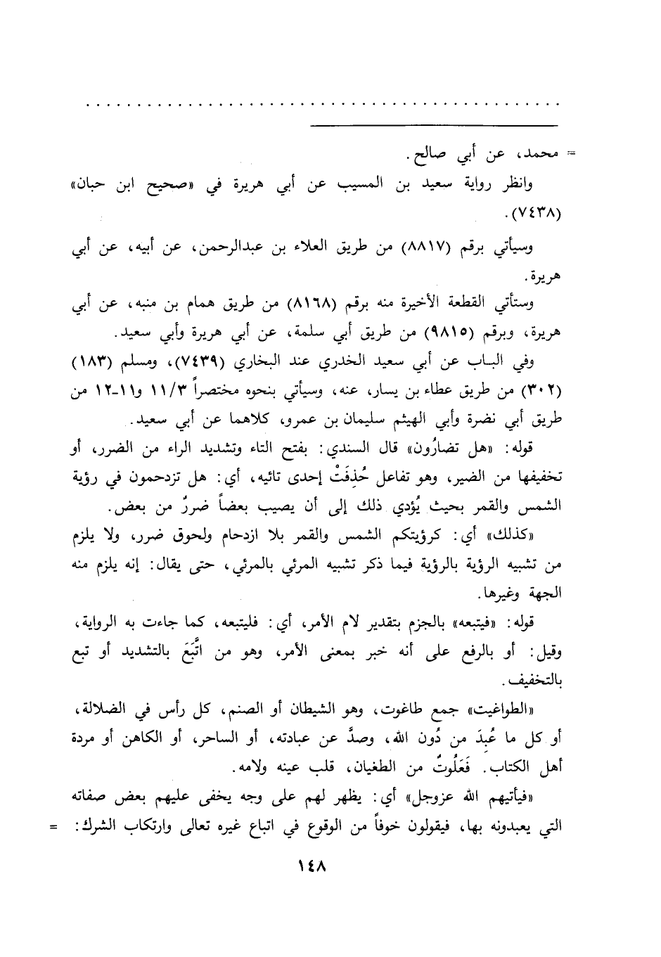 قوله: "هل تضارُون" قال السندي: بفتح التاء وتشديد الراء من الضرر، أو تخفيفها من الضير، وهو تفاعل حُذِفَتْ إحدى تائيه، أي: هل تزدحمون في رؤية الشمس والقمر بحيث يُؤدي ذلك إلى أن يصيب بعضاً ضررٌ من بعض.