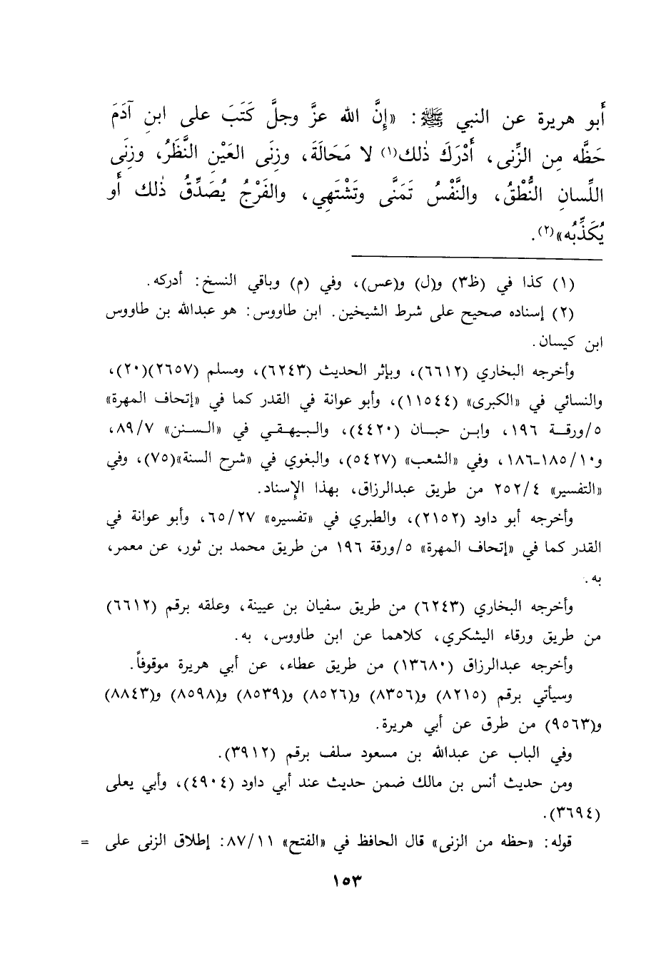 أَبُو هُرَيْرَةَ: عَنِ النَّبِيِّ صَلَّى اللهُ عَلَيْهِ وَسَلَّمَ: " إِنَّ اللهَ عَزَّ وَجَلَّ كَتَبَ عَلَى ابْنِ آدَمَ حَظَّهُ مِنَ الزِّنَا، أَدْرَكَ ذَلِكَ (١) لَا مَحَالَةَ، وَزِنَا الْعَيْنِ النَّظَرُ، وَزِنَا اللِّسَانِ النُّطْقُ، وَالنَّفْسُ تَمَنَّى وَتَشْتَهِي، وَالْفَرْجُ يُصَدِّقُ ذَلِكَ أَوْ يُكَذِّبُهُ " (٢)