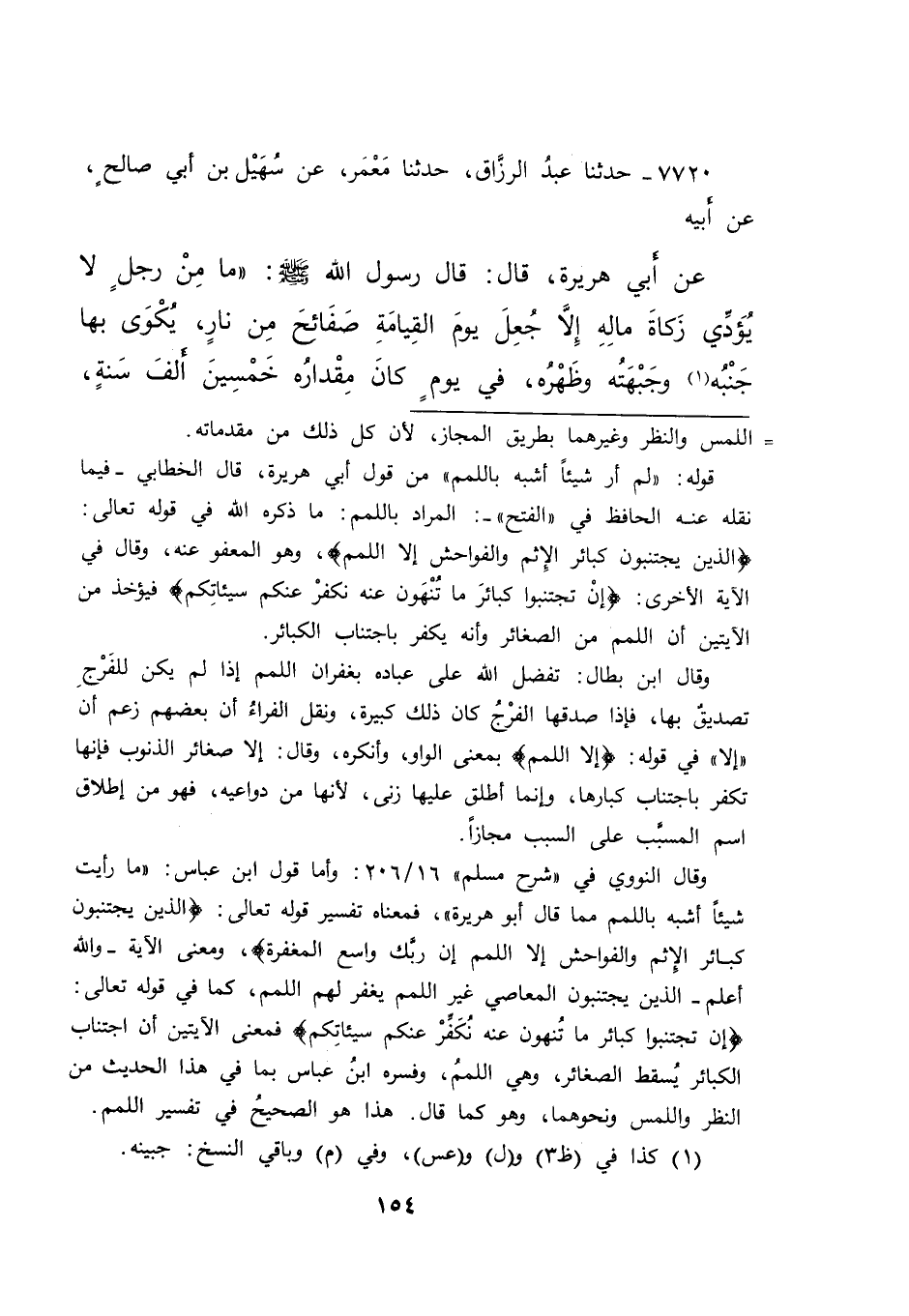 وقال النووي في "شرح مسلم" ١٦/٢٠٦: وأما قول ابن عباس: "ما رأيت شيئاً أشبه باللمم مما قال أبو هريرة"، فمعناه تفسير قوله تعالى: (الذين يجتنبون كبائر الإثم والفواحش إلا اللمم إن ربَّك واسع المغفرة) ، ومعنى الآية -والله أعلم- الذين يجتنبون المعاصي غير اللمم يغفر لهم اللمم، كما في قوله تعالى: (إن تجتنبوا كبائر ما تُنهون عنه نُكَفِّرْ عنكم سيئاتِكم) فمعنى الآيتين أن اجتناب الكبائر يُسقط الصغائر، وهي اللممُ، وفسره ابن عباس بما في هذا الحديث من النظر واللمس ونحوهما، وهو كما قال. هذا هو الصحيحُ في تفسير اللمم.