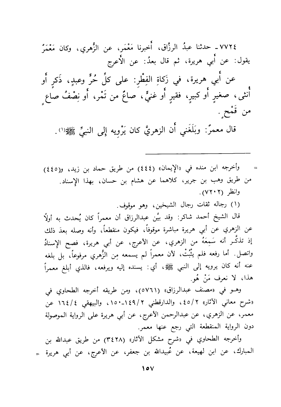 ٧٧٢٤ - حَدَّثَنَا عَبْدُ الرَّزَّاقِ، أَخْبَرَنَا مَعْمَرٌ، عَنِ الزُّهْرِيِّ، وَكَانَ مَعْمَرٌ، يَقُولُ: عَنْ أَبِي هُرَيْرَةَ - ثُمَّ قَالَ بَعْدُ -، عَنِ الْأَعْرَجِ، عَنْ أَبِي هُرَيْرَةَ، فِي زَكَاةِ الْفِطْرِ: " عَلَى كُلِّ حُرٍّ وَعَبْدٍ، ذَكَرٍ أَوْ أُنْثَى، صَغِيرٍ أَوْ كَبِيرٍ، فَقِيرٍ أَوْ غَنِيٍّ، صَاعٌ مِنْ تَمْرٍ، أَوْ نِصْفُ صَاعٍ مِنْ قَمْحٍ " قَالَ مَعْمَرٌ: وَبَلَغَنِي أَنَّ الزُّهْرِيَّ، كَانَ يَرْوِيهِ إِلَى النَّبِيِّ صَلَّى اللهُ عَلَيْهِ وَسَلَّمَ (١)