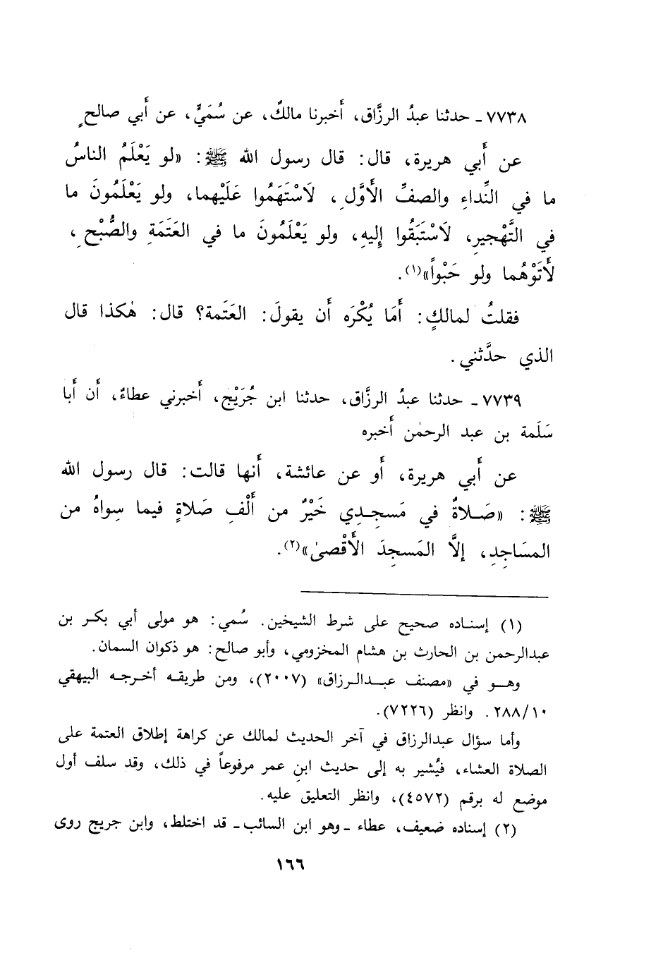٧٧٣٨ - حَدَّثَنَا عَبْدُ الرَّزَّاقِ، أَخْبَرَنَا مَالِكٌ، عَنْ سُمَيٍّ، عَنْ أَبِي صَالِحٍ، عَنْ أَبِي هُرَيْرَةَ، قَالَ: قَالَ رَسُولُ اللهِ صَلَّى اللهُ عَلَيْهِ وَسَلَّمَ: " لَوْ يَعْلَمُ النَّاسُ مَا فِي النِّدَاءِ وَالصَّفِّ الْأَوَّلِ، لَاسْتَهَمُوا عَلَيْهِمَا، وَلَوْ يَعْلَمُونَ مَا فِي التَّهْجِيرِ، لَاسْتَبَقُوا إِلَيْهِ، وَلَوْ يَعْلَمُونَ مَا فِي الْعَتَمَةِ وَالصُّبْحِ، لَأَتَوْهُمَا وَلَوْ حَبْوًا " (١) فَقُلْتُ لِمَالِكٍ: أَمَا يُكْرَهُ أَنْ يَقُولَ: الْعَتَمَةَ؟ قَالَ: " هَكَذَا قَالَ الَّذِي حَدَّثَنِي "