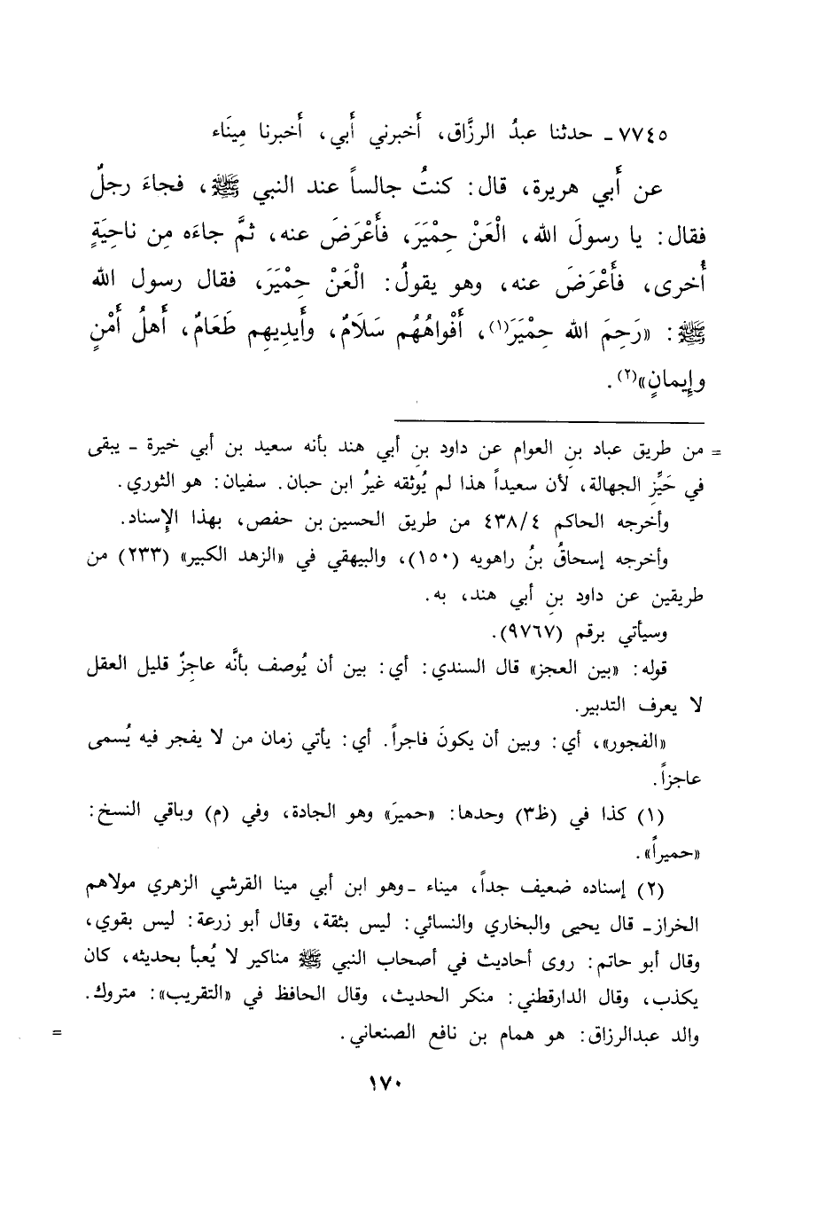 ٧٧٤٥ - حَدَّثَنَا عَبْدُ الرَّزَّاقِ، أَخْبَرَنِي أَبِي، أَخْبَرَنَا مِينَاءُ، عَنْ أَبِي هُرَيْرَةَ، قَالَ: كُنْتُ جَالِسًا عِنْدَ النَّبِيِّ صَلَّى اللهُ عَلَيْهِ وَسَلَّمَ، فَجَاءَ رَجُلٌ فَقَالَ: يَا رَسُولَ اللهِ، الْعَنْ حِمْيَرَ، فَأَعْرَضَ عَنْهُ، ثُمَّ جَاءَهُ مِنْ نَاحِيَةٍ أُخْرَى، فَأَعْرَضَ عَنْهُ، وَهُوَ يَقُولُ: الْعَنْ حِمْيَرَ، فَقَالَ رَسُولُ اللهِ صَلَّى اللهُ عَلَيْهِ وَسَلَّمَ: " رَحِمَ اللهُ حِمْيَرَ (١) ، أَفْوَاهُهُمْ سَلَامٌ، وَأَيْدِيهِمْ طَعَامٌ، أَهْلُ أَمْنٍ وَإِيمَانٍ " (٢)