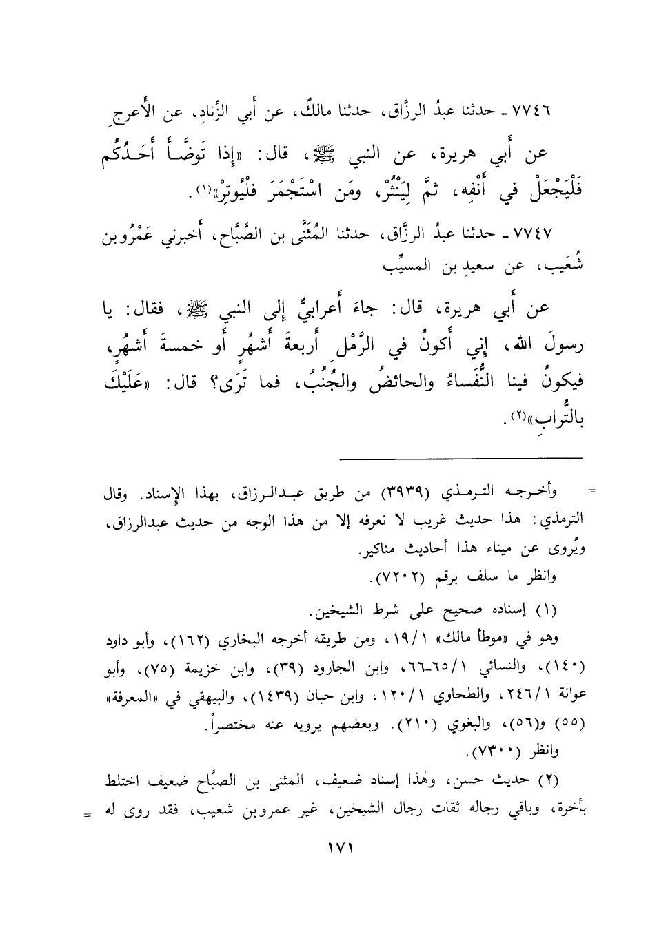 ٧٧٤٦ - حَدَّثَنَا عَبْدُ الرَّزَّاقِ، حَدَّثَنَا مَالِكٌ، عَنْ أَبِي الزِّنَادِ، عَنِ الْأَعْرَجِ، عَنْ أَبِي هُرَيْرَةَ، عَنِ النَّبِيِّ صَلَّى اللهُ عَلَيْهِ وَسَلَّمَ قَالَ: " إِذَا تَوَضَّأَ أَحَدُكُمْ فَلْيَجْعَلْ فِي أَنْفِهِ، ثُمَّ لِيَنْثِرْ، وَمَنِ اسْتَجْمَرَ فَلْيُوتِرْ " (١)