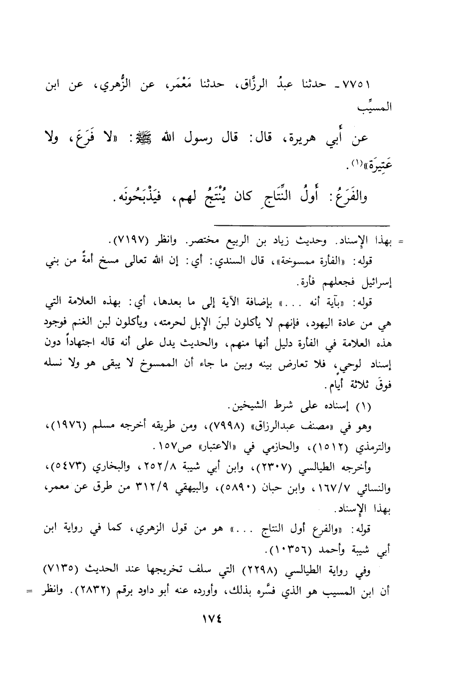 ٧٧٥١ - حَدَّثَنَا عَبْدُ الرَّزَّاقِ، حَدَّثَنَا مَعْمَرٌ، عَنِ الزُّهْرِيِّ، عَنِ ابْنِ الْمُسَيِّبِ، عَنْ أَبِي هُرَيْرَةَ، قَالَ: قَالَ رَسُولُ اللهِ صَلَّى اللهُ عَلَيْهِ وَسَلَّمَ: " لَا فَرَعَ، وَلَا عَتِيرَةَ " (١) وَالْفَرَعُ أَوَّلُ النِّتَاجِ كَانَ يُنْتَجُ لَهُمْ، فَيَذْبَحُونَهُ