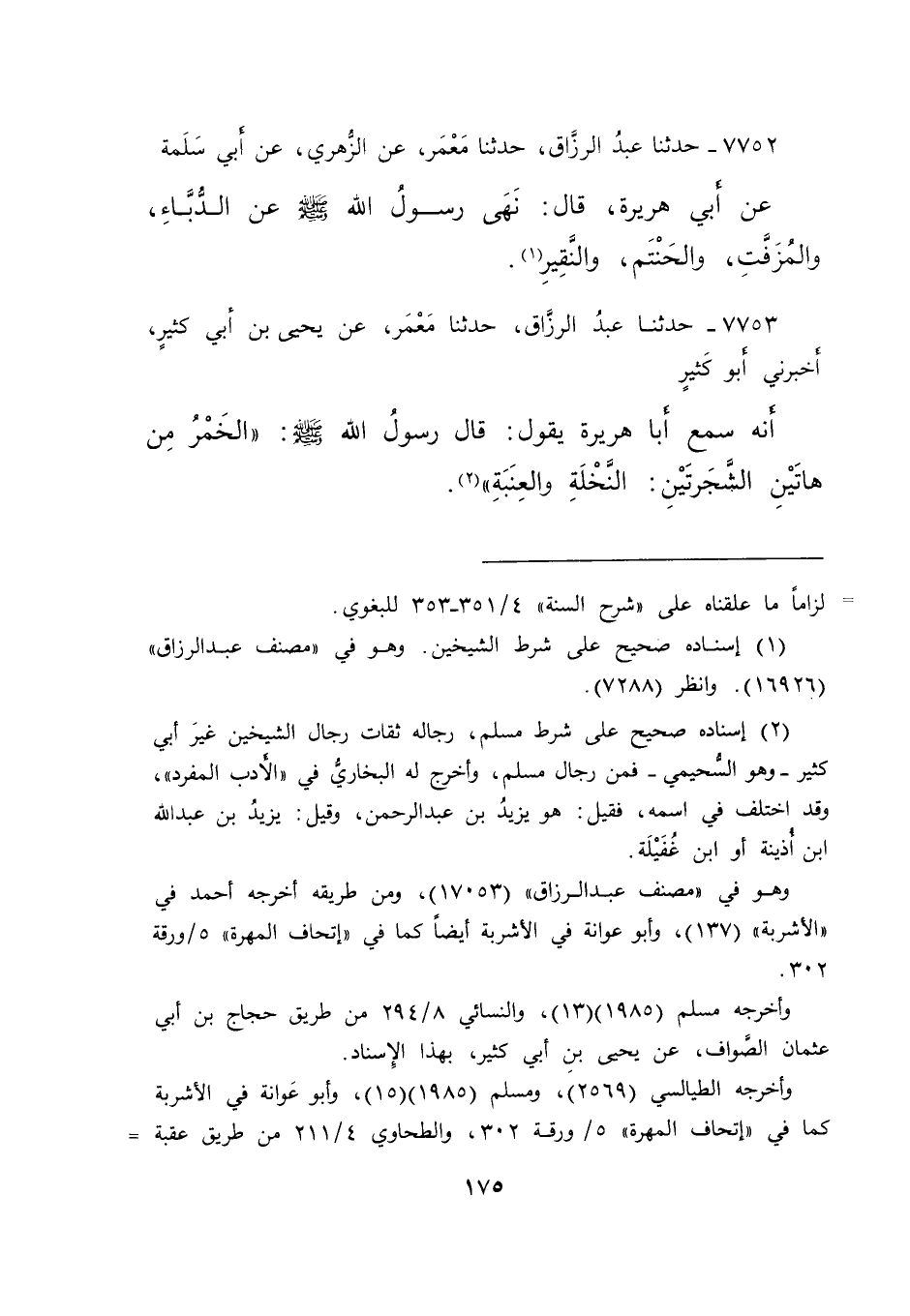 ٧٧٥٣ - حَدَّثَنَا عَبْدُ الرَّزَّاقِ، حَدَّثَنَا مَعْمَرٌ، عَنْ يَحْيَى بْنِ أَبِي كَثِيرٍ، أَخْبَرَنِي أَبُو كَثِيرٍ، أَنَّهُ سَمِعَ أَبَا هُرَيْرَةَ، يَقُولُ: قَالَ رَسُولُ اللهِ صَلَّى اللهُ عَلَيْهِ وَسَلَّمَ: " الْخَمْرُ مِنْ هَاتَيْنِ الشَّجَرَتَيْنِ: النَّخْلَةِ وَالْعِنَبَةِ " (٢)