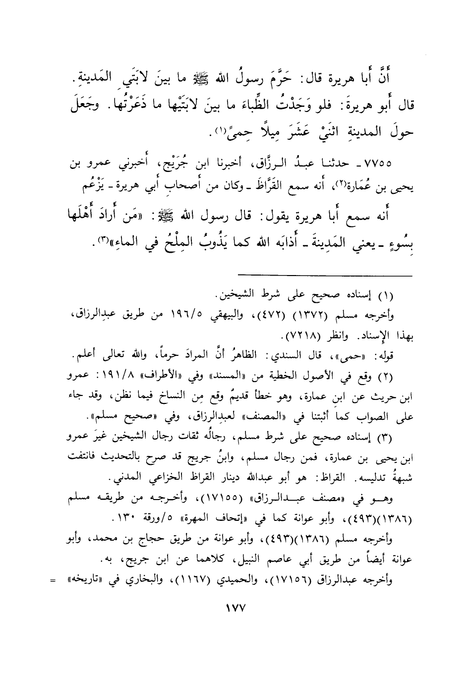 ٧٧٥٥ - حَدَّثَنَا عَبْدُ الرَّزَّاقِ، أَخْبَرَنَا ابْنُ جُرَيْجٍ، أَخْبَرَنِي عَمْرُو بْنُ يَحْيَى بْنِ عُمَارَةَ (٢) ، أَنَّهُ سَمِعَ الْقَرَّاظَ - وَكَانَ مِنْ أَصْحَابِ أَبِي هُرَيْرَةَ يَزْعُمُ -، أَنَّهُ سَمِعَ أَبَا هُرَيْرَةَ، يَقُولُ: قَالَ رَسُولُ اللهِ صَلَّى اللهُ عَلَيْهِ وَسَلَّمَ: " مَنْ أَرَادَ أَهْلَهَا بِسُوءٍ - يَعْنِي الْمَدِينَةَ - أَذَابَهُ اللهُ كَمَا يَذُوبُ الْمِلْحُ فِي الْمَاءِ " (٣)