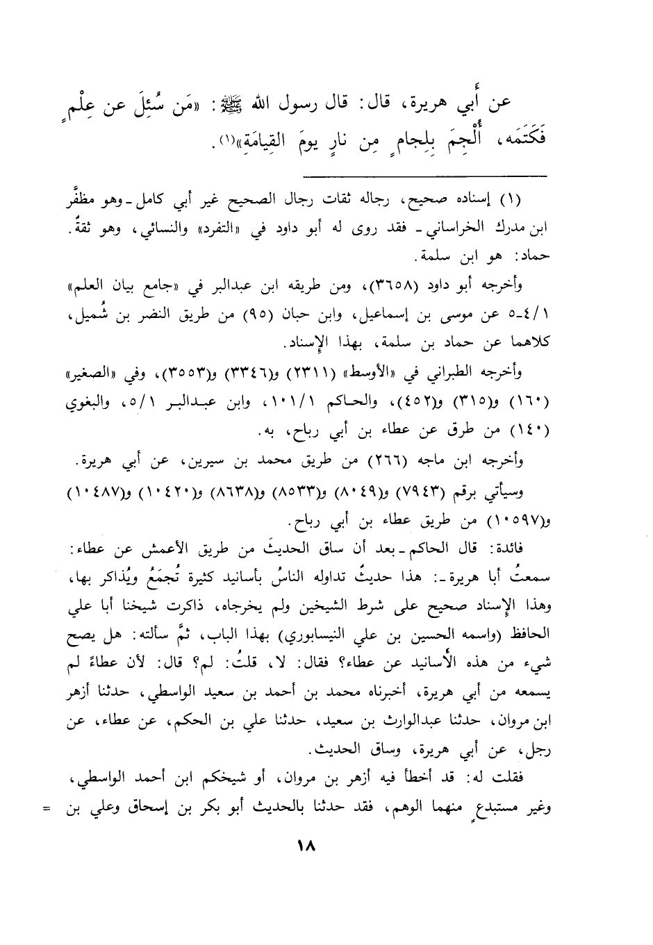 عَنْ أَبِي هُرَيْرَةَ، قَالَ: قَالَ رَسُولُ اللهِ صَلَّى اللهُ عَلَيْهِ وَسَلَّمَ: " مَنْ سُئِلَ عَنْ عِلْمٍ فَكَتَمَهُ، أُلْجِمَ بِلِجَامٍ مِنْ نَارٍ يَوْمَ الْقِيَامَةِ " (١)