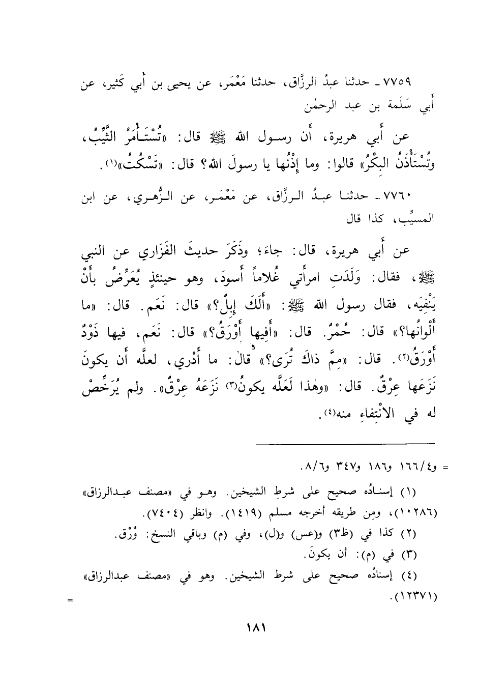 ٧٧٦٠ - حَدَّثَنَا عَبْدِ الرَّزَّاقِ، عَنْ مَعْمَرٍ، عَنِ الزُّهْرِيِّ، عَنِ ابْنِ الْمُسَيِّبِ، كَذَا قَالَ: عَنْ أَبِي هُرَيْرَةَ، قَالَ - جَاءَ وَذَكَرَ حَدِيثَ الْفَزَارِيِّ - عَنِ النَّبِيِّ صَلَّى اللهُ عَلَيْهِ وَسَلَّمَ، فَقَالَ: وَلَدَتِ امْرَأَتِي غُلَامًا أَسْوَدَ، وَهُوَ حِينَئِذٍ يُعَرِّضُ بِأَنْ يَنْفِيَهُ، فَقَالَ رَسُولُ اللهِ صَلَّى اللهُ عَلَيْهِ وَسَلَّمَ: " أَلَكَ إِبِلٌ؟ " قَالَ: نَعَمْ. قَالَ: " مَا أَلْوَانُهَا؟ " قَالَ: حُمْرٌ. قَالَ: " أَفِيهَا أَوْرَقُ (٢) ؟ " قَالَ: نَعَمْ، فِيهَا ذَوْدٌ وُرْقٌ. قَالَ: " مِمَّ ذَاكَ تَرَى؟ " قَالَ: مَا أَدْرِي، لَعَلَّهُ أَنْ يَكُونَ (٣) نَزَعَهَا عِرْقٌ. قَالَ: " وَهَذَا لَعَلَّهُ أَنْ يَكُونَ نَزَعَهُ عِرْقٌ ". وَلَمْ يُرَخِّصْ لَهُ فِي الِانْتِفَاءِ مِنْهُ (٤)